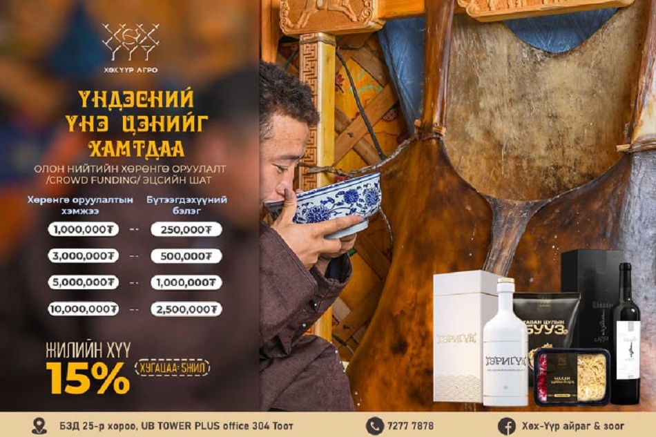 Таны хөрөнгө оруулалт "Хөх Үүр Агро" ХХК буюу уламжлалт аргаар бэлтгэдэг хүнсний үйлдвэрлэлийг бүтээн босгоход зарцуулагдах юм.