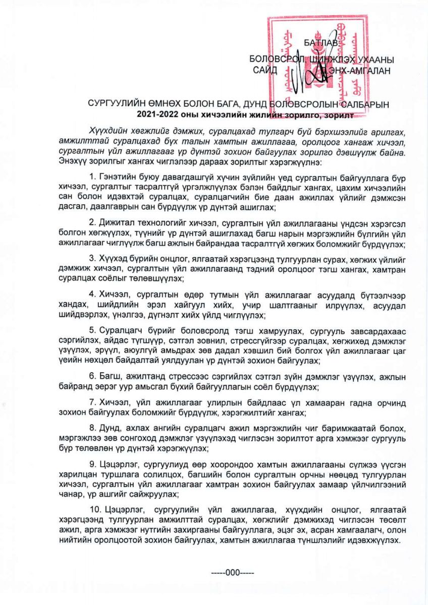 - Гэнэтийн, давагдашгүй хүчин зүйлийн үед сургалтын байгууллага бүр хичээл сургалтыг тасралтгүй үргэлжлүүлэн бэлэн байдлыг хангах, цахим хичээлийн сан болон идэвхтэй суралцах, суралцагчийн бие даан ажиллах үйлийг дэмжсэн дасгал, даалгаврын сан бүрдүүлж, үр дүнтэй ашиглах