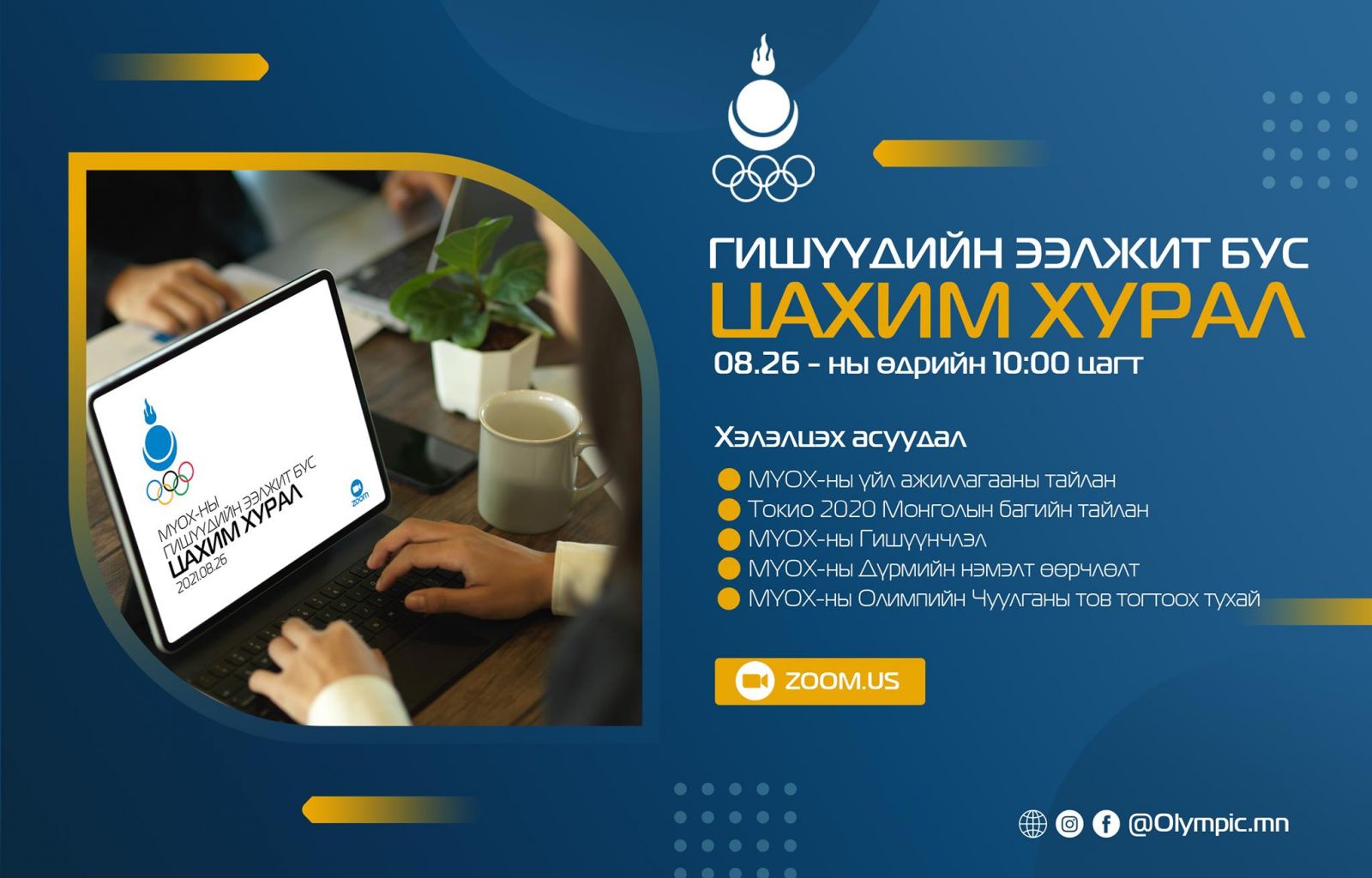 Монголын үндэсний олимпын хороо /МҮОХ/-ны Гишүүдийн ээлжит бус хурал 2021.08.26-ны өдрийн 10:00 цагт цахим хэлбэрээр зохион байгуулагдана.