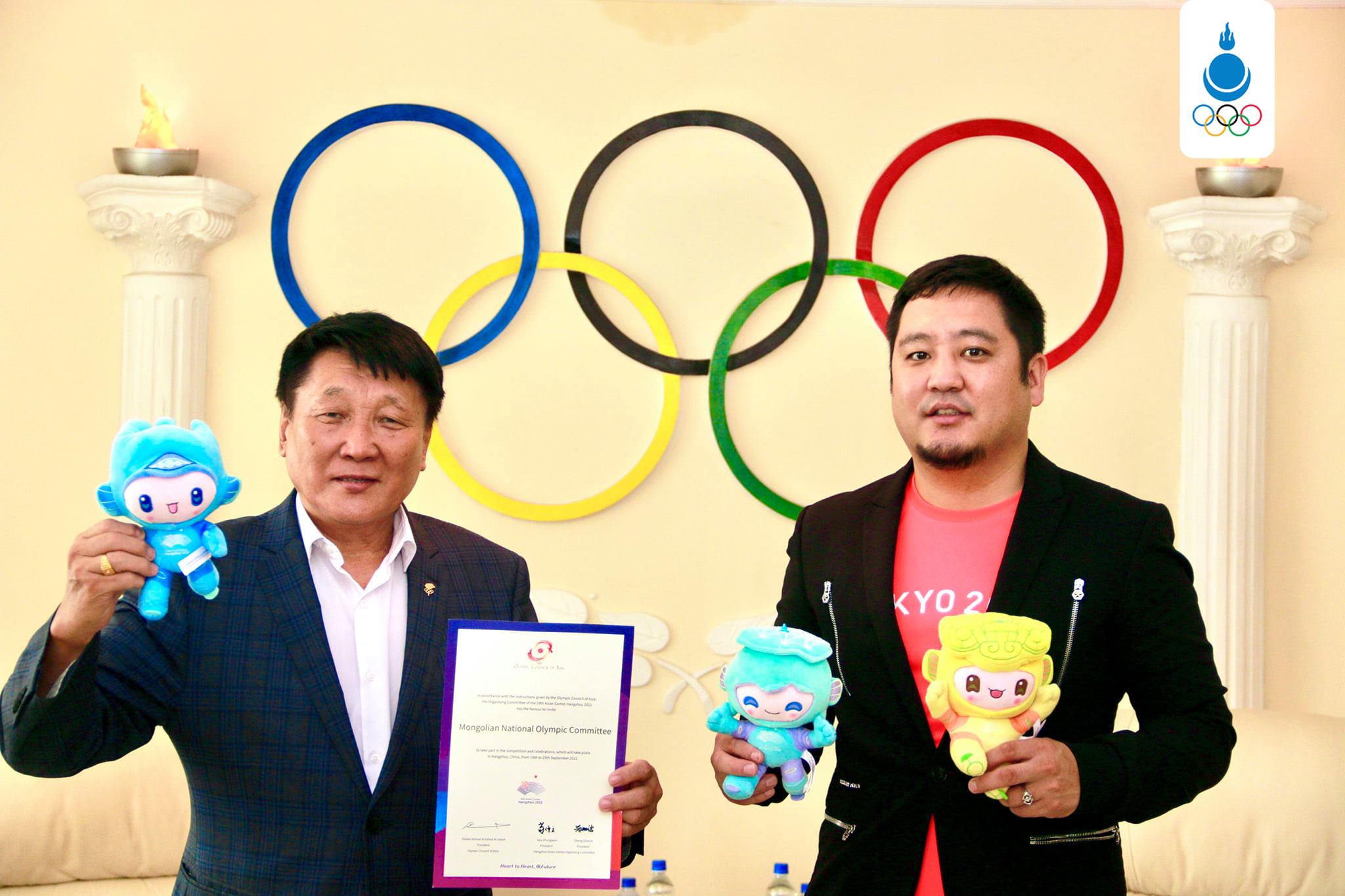 “Ханжоу-2022” Азийн наадмыг Зохион байгуулах хорооноос тус наадамд оролцох албан ёсны урилгыг тухайн наадмын маскотын хамт МҮОХ-нд ирүүллээ. Ингэснээр Монголын баг тамирчид ирэх оны Азийн наадамд оролцох эрх албан ёсоор үүсэж байна.