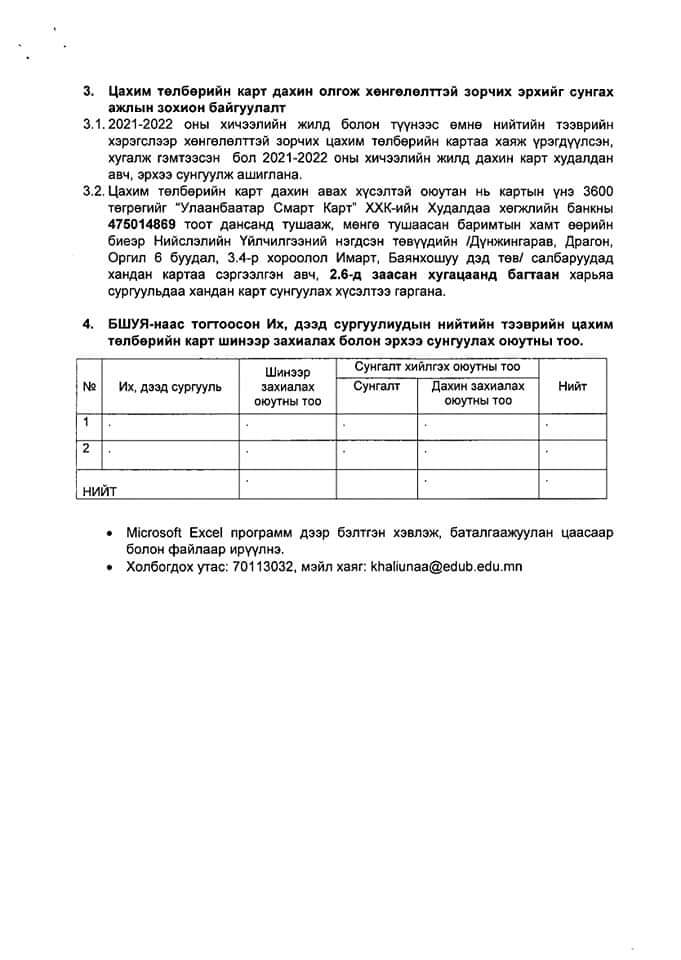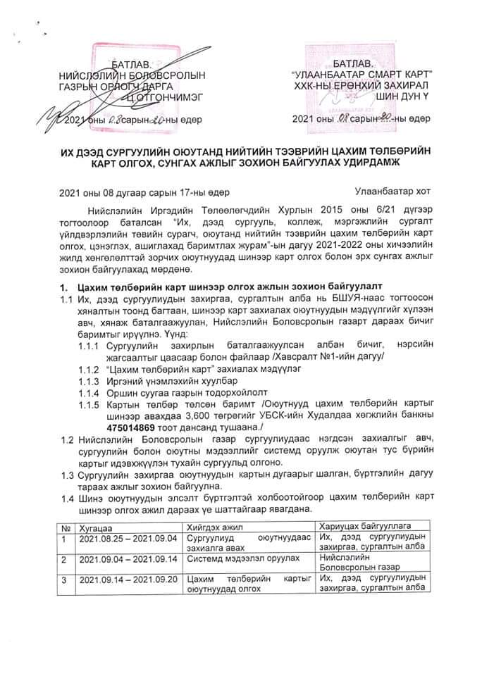 Удирдамжид дурдсанаар их, дээд сургуулиудын захиргаа, суралтын алба нь БШУЯ-наас тогтоосон хяналтын тоонд багтаан, шинээр карт захиалах оюутнуудын мэдүүлгийг хүлээн авч баталгаажуулна. Оюутанд зориулсан цахим төлбөрийн картыг шинэ авах үнэ 3,600 төгрөг байхаар тогтоожээ.