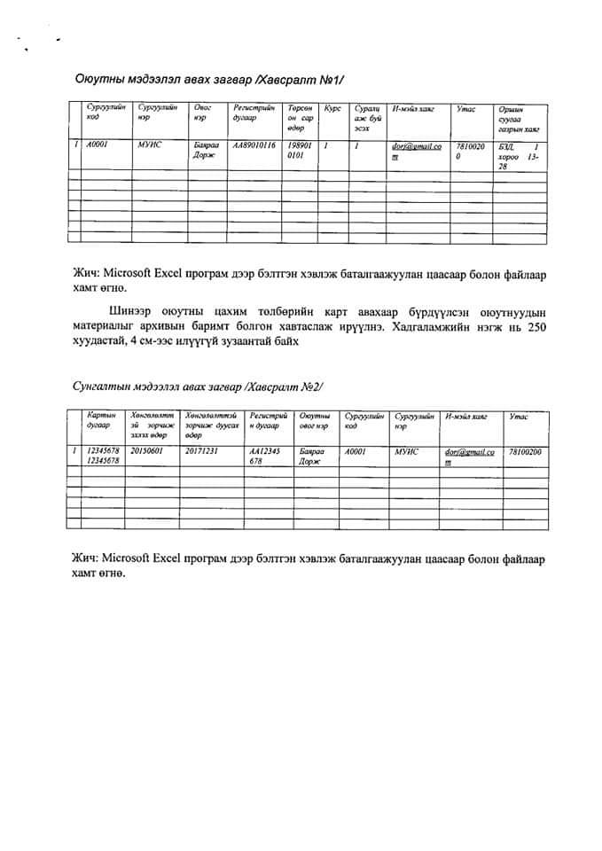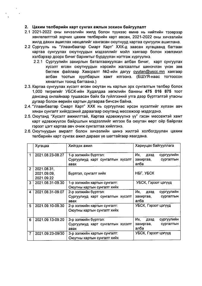 Есдүгээр сарын 4-14-нд дээрх мэдээллийг системд оруулснаар 14-нөөс эхлэн их, дээд сургуулиудын захиргаа, сургалтын албаар дамжуулж, нийтийн тээвэрт зорчих цахим төлбөрийг картыг оюутнуудад олгох аж.