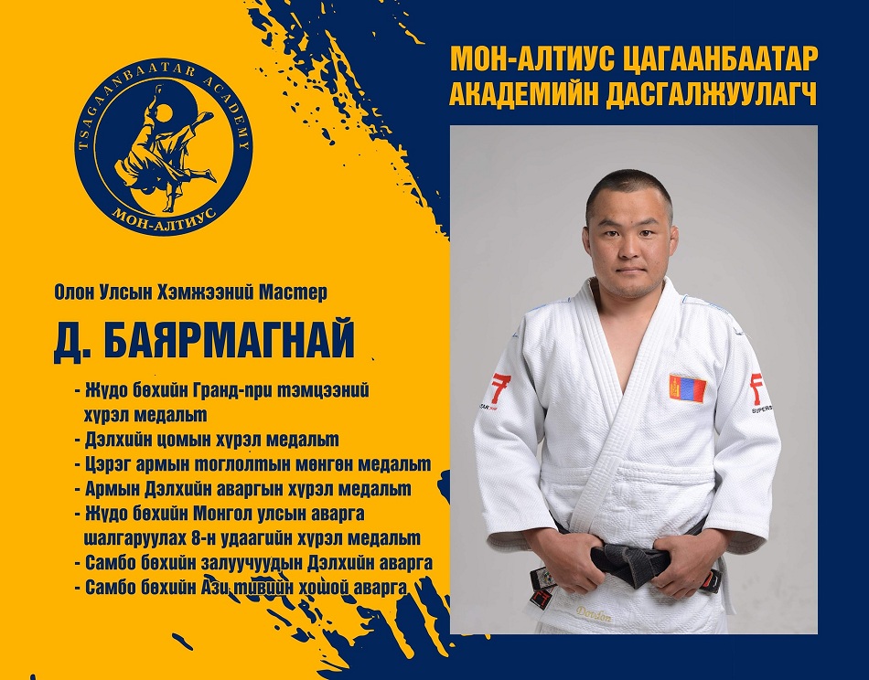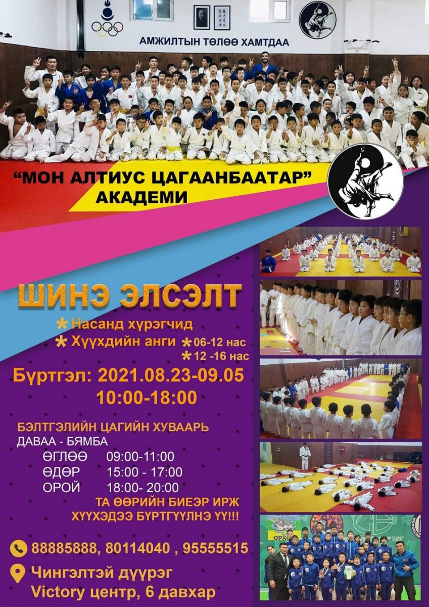 Жүдо бөхөөр хичээллэж, тив, дэлхийд улс орныхоо төрийн далбааг мандуулахыг зорьсон хэн бүхэнд зориулан үүдээ нээсэн "Мон-Алтиус Цагаанбаатар" академид суралцахыг хүсвэл есдүгээр сарын 05-ны өдрүүдэд амжиж бүртгүүлээрэй.
