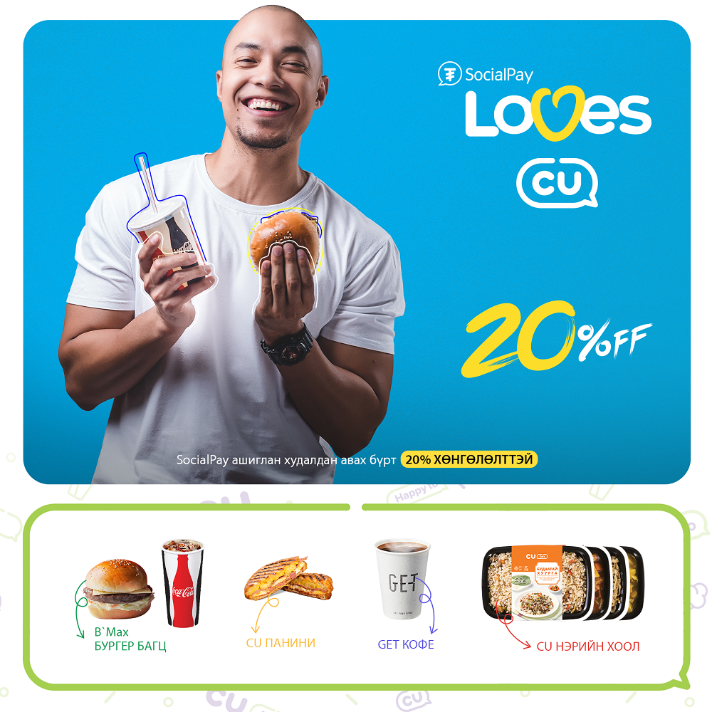 Та энэхүү урамшууллын хугацаанд CU сүлжээ дэлгүүрээс худалдан авалт хийхдээ SocialPay аппликэйшн ашиглан төлбөрөө төлснөөр 20%-ийн хөнгөлөлт эдлэх боломжтой юм.