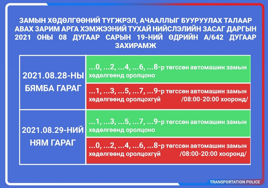 Замын хөдөлгөөний түгжрэл, ачааллыг бууруулах талаар авах зарим арга хэмжээний тухай Нийслэлийн Засаг даргын 2021 оны наймдугаар сарын 19-ний өдрийн А/642 дугаар захирамж гарчээ.