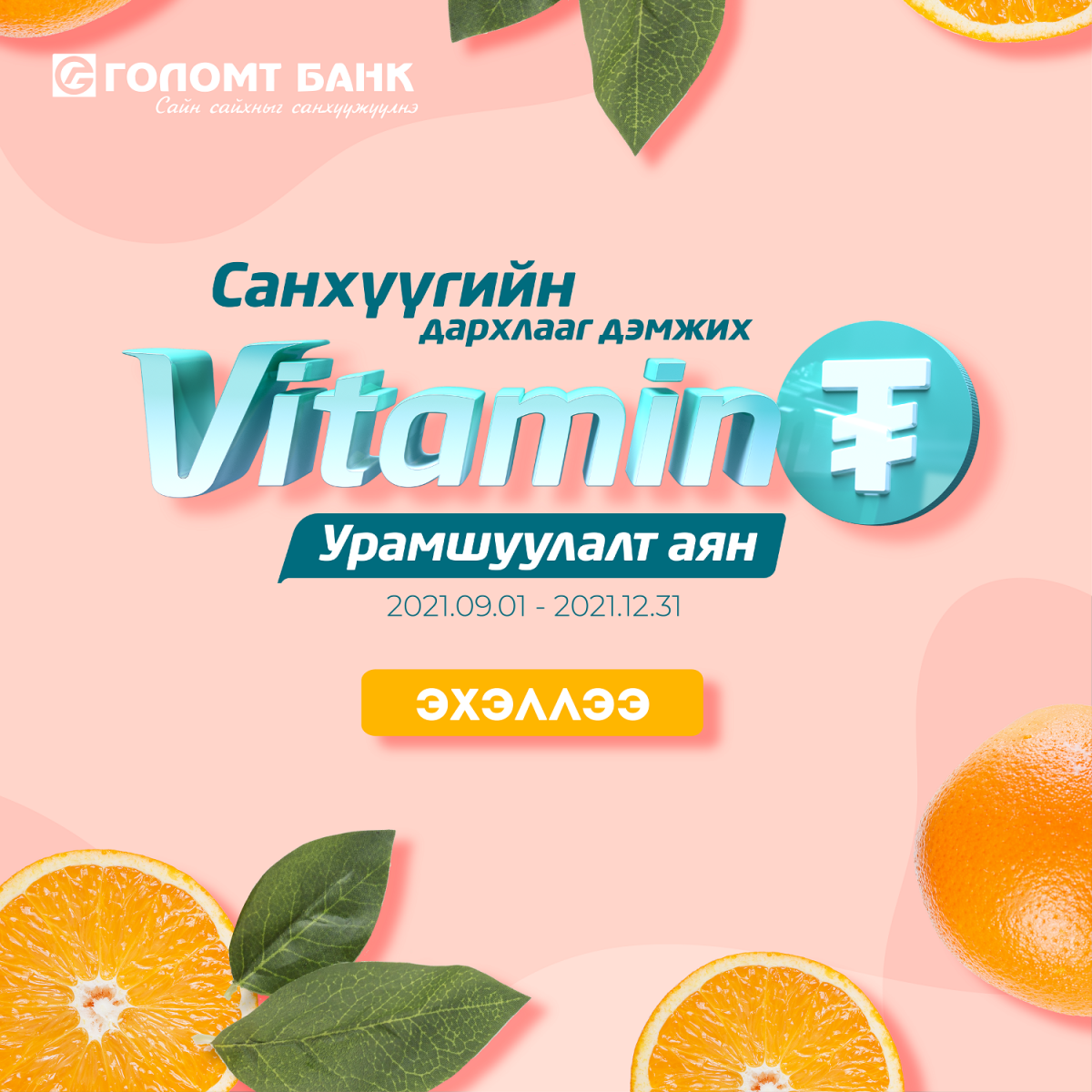 Эрүүл мэндийн дархлаагаа амьдралын зөв хэмнэл, витаминаар дэмждэгийн нэгэн адилаар харилцагч та “Витамин ₮” аянд оролцож санхүүгийн дархлаатай болох аянд нэгдээрэй. Хэрэв та Голомт банкнаас гаргадаг хугацаатай хадгаламжийн бүтээгдэхүүний талаар илүү дэлгэрэнгүй мэдээлэл авахыг хүсвэл ЭНД дарна уу.