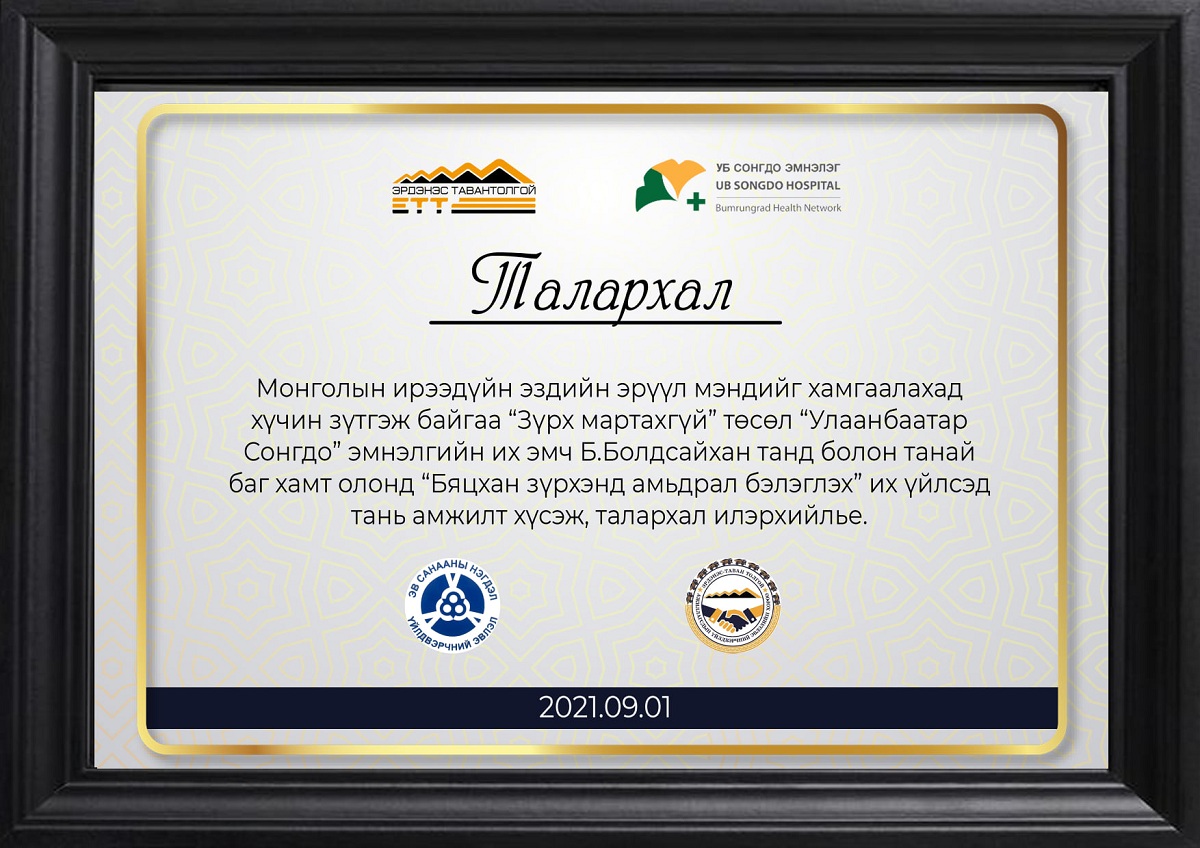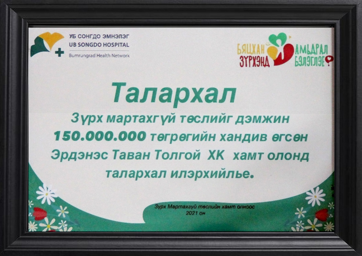 “Хүүхдэд ээлтэй ЭТТ хөтөлбөр”-ийг хэрэгжүүлэх чиг үүрэг бүхий “Эв санааны нэгдэл” болон “Ажиллагсдын үйлдвэрчний эвлэл”-ийн хамтарсан Зөвлөлийн 2021 оны наймдугаар сарын 24-ний өдрийн шийдвэрээр зүрхний төрөлхийн гажигтай хүүхдүүдийн эх орондоо эмчилж буй “ЗҮРХ МАРТАХГҮЙ” төсөлд 150 сая төгрөг хандивлалаа. Энэхүү хандив нь нийт 22 хүүхдийн зүрхний хагалгааны зардал болох юм.