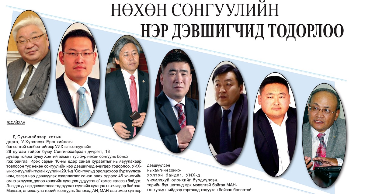 УИХ-ын сонгуулийн тухай хуулийн 29.1-д “Сонгуульд оролцохоор бүртгүүлсэн нам, эвсэл нэр дэвшүүлэх ажиллагааг санал авах өдрөөс 45 хоногийн өмнө эхлүүлж, долоо хоногийн хугацаанд дуусгана” хэмээн заасан байдаг. Энэ дагуу нэр дэвшигчдээ тодруулах сүүлийн хугацаа нь өчигдөр байлаа. Мэдээж, аливаа улс төрийн сонгууль болоход АН, МАН-аас ямар хүн нэр дэвшүүлсэн нь хамгийн сонирхолтой байдаг. УИХ-д үнэмлэхүй олонхийг бүрдүүлсэн, төрийн бүх шатанд эрх мэдэлтэй байгаа МАН-ын хувьд шийдвэр гаргахад хэцүүхэн байсан бололтой.