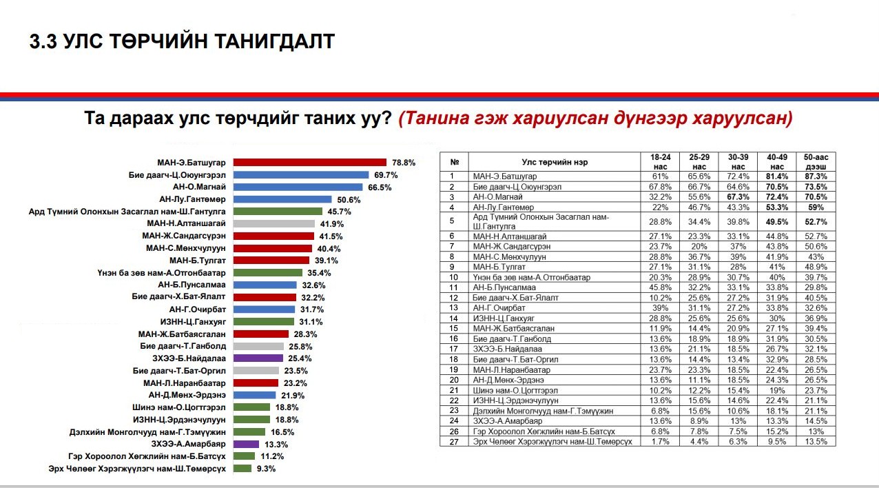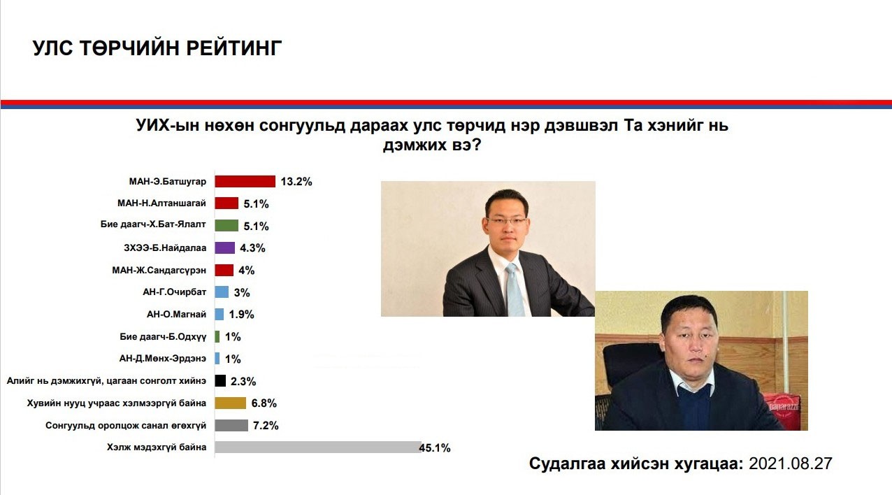 МАН-ын хувьд 2020 оны УИХ-ын сонгуулиар ялалт байгуулсан хоёр тойрогтоо нөхөн сонгогдох нэр дэвшигчдийг тун нарийн судалгаа, шалгуураар гаргаж ирсэн гэдгээ онцолж буй юм. Тухайлбал, нөхөн сонгууль болох хоёр тойрогт нэр хүндтэй, туршлагатай судалгааны байгууллагуудаар удаа дараа социологийн судалгаа хийлгэж, нэр дэвшин сонгогдох магадлал өндөр улстөрчдийн рейтингийг гаргуулжээ. Дээрх судалгаануудын дүнгээр Хэнтийд Ц.Идэрбат, Сонгинохайрхан Э.Батшугар нар хамгийн өндөр рейтингтэй бөгөөд олонд илүү танигдсан улстөрч гэдэг нь батлагджээ.