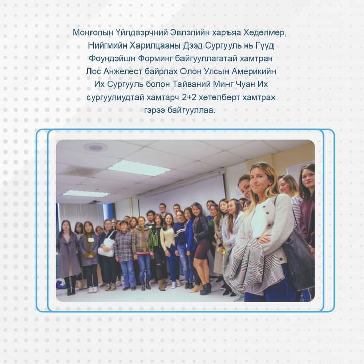 Монголын Үйлдвэрчний Эвлэлийн харъяа Хөдөлмөр, Нийгмийн Харилцааны Дээд Сургууль нь Гүүд Фоундэйшн Форминг байгууллагатай хамтран Лос Анжелест байрлах Олон Улсын Америкийн Их Сургууль болон Тайваний Их сургуулиудтай хамтарч 2+2 хөтөлбөрт хамтрах гэрээ байгууллаа.