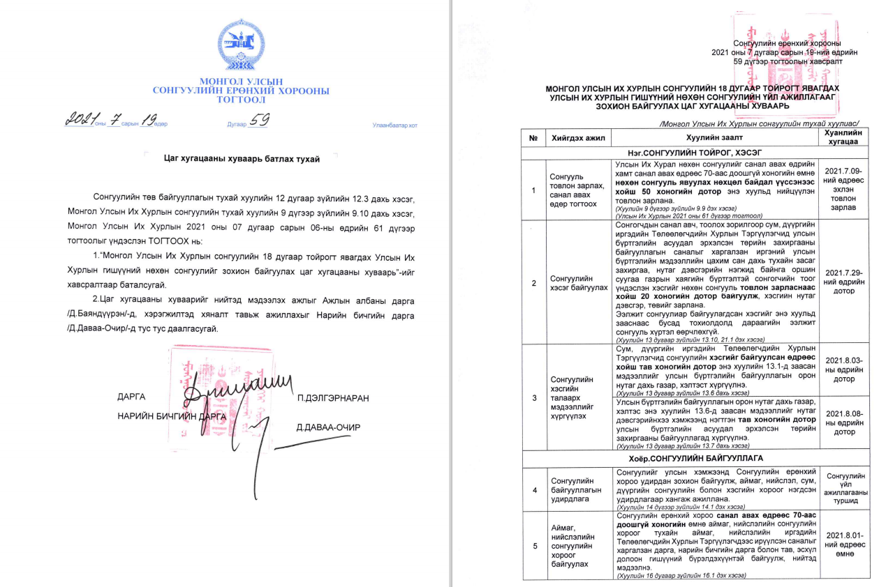 Хуульд зааснаар нөхөн сонгуульд оролцох нам, эвсэл нэр дэвшигчдээ өнгөрсөн долоо хоногт албан ёсоор тодруулсан. Тэгвэл УИХ-ын 18 дугаар тойрог буюу Хэнтий аймагт болох нөхөн сонгуулийн цаг хугацааны дараалал, зураглалыг уншигчдадаа хүргэж байна.