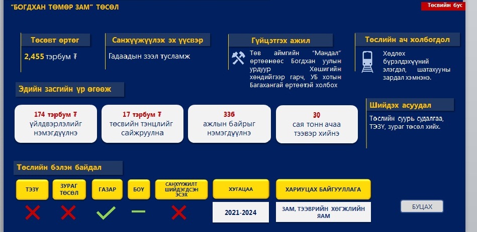Ийм нэгэн урт түүхтэй Богд хан төмөр замын төсөл ТЭЗҮ хийх шатандаа гацаад байгаа мэдээлэл байна. Хэрэгжих шатандаа урт ч гуншин үйлдвэрлэх бололтой. Нэмэлт мэдээлэл хүргэхэд, уг төслийн ерөнхий гүйцэтгэгчээр Тавантолгой-Гашуунсухайт чиглэлийг тавьж буй “Бодь интернэшнл” компани хэдийнэ тодорчихсон гэдгийг улс төрийн хүрээнд ярих болсон. Голомт банкны Д.Баясгалангаар овоглодог тус компани Тавантолгой-Гашуунсухайт чиглэлийн төмөр замын гүйцэтгэгчээр мөн л учир битүүлгээр гэнэт тодорч байсан гуншинтай. Үндэсний аюулгүй байдлын зөвлөлөөр дэмжигдсэн гэдгээс өөр тайлбар байдаггүй юм. “Бодь интернэшнл” компани Тавантолгой-Гашуунсухайт чиглэлийн төмөр замыг ирэх 2022 оны долоодугаар сард хүлээлгэж өгөх төлөвлөгөөтэй байгаа. Монголын төр тус компанийг энэ удаад ч гүйцэтгэгчээр шалгаруулсан нь одоогийн ажлаасаа багагүй туршлага хуримтлуулсан гэж үзсэнтэй холбоотой бололтой. Ямартай ч Монгол Улсын нутаг дэвсгэрийг дамжин хөрш орнууд болон Евразийг холбох “Эдийн засгийн коридор” бий болоход дэмтэй ажил урагшлах сураг гарсан нь сайн хэрэг.
