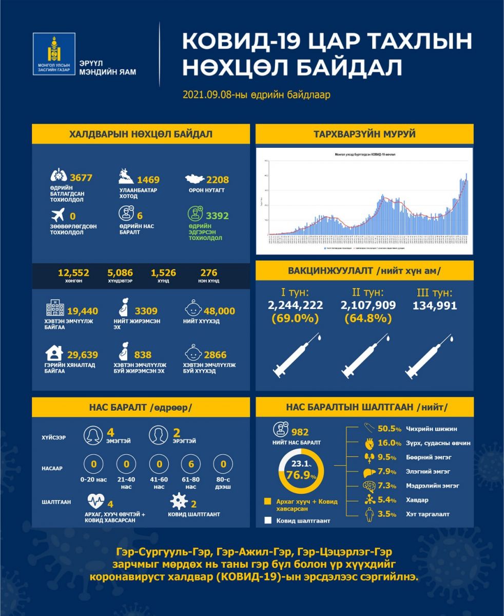 Өчигдрийн мэдээллээр ковидын тохиолдол 3963 бүртгэгдсэн бол өнөөдөр энэ тоо буурч, сүүлийн 24 цагт 3677 шинэ тохиолдол илэрлээ. Мөн архаг хууч өвчтэй, ковид хавсарсан 61-80 насны дөрвөн эмэгтэй, хоёр эрэгтэй нас барсан байна.