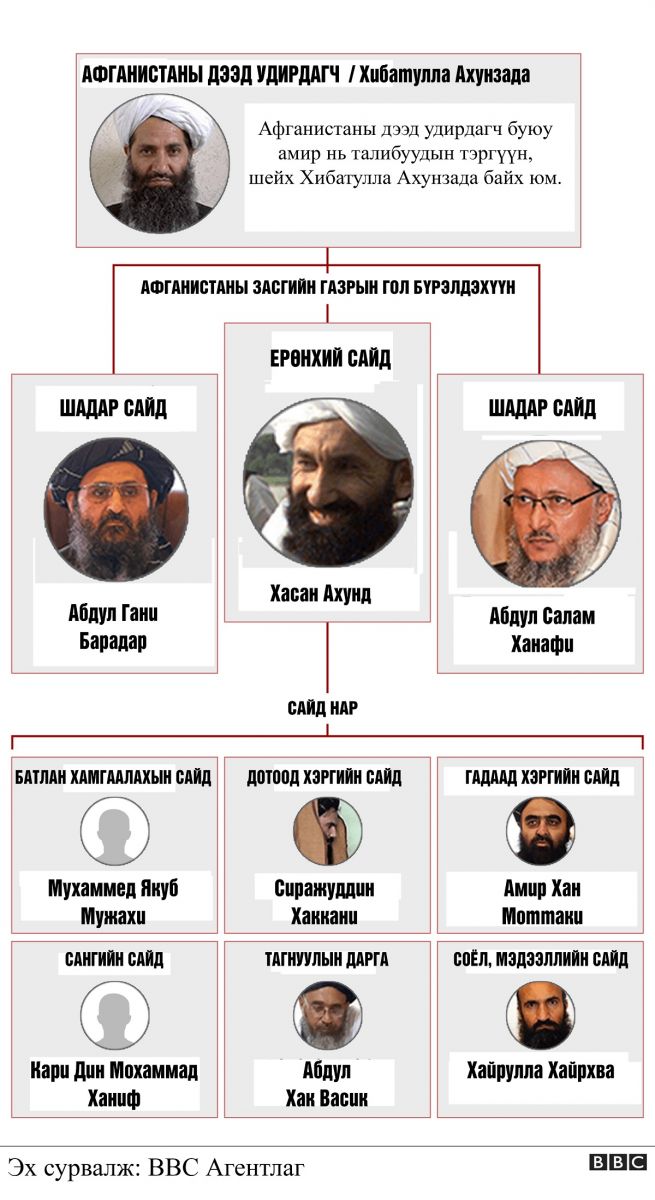 Талибууд Афганистаны шинэ түр Засгийн газрын бүрэлдэхүүнийг зарлажээ. Афганистаны дээд удирдагч буюу амир нь талибуудын тэргүүн, шейх Хибатулла Ахунзада байх ажээ. Тэрбээр шашиндаа үнэнч, шариатын хуулийг нэвтрүүлэхийг дэмждэг гэдгээрээ алдартай. Ахунзадагийн амь насыг хөнөөх оролдлого хоёронтоо гарч байсан бөгөөд 2019 онд үйлдэгдсэн халдлагын үеэр түүний дүү болон эцэг нь амиа алдсан юм. Харин шинэ Засгийн газрыг Хасан Ахунд тэргүүлэх бөгөөд түүний орлогчоор Абдул Гани Барадар, Абдул Салам Ханафи нар ажиллах юм байна.