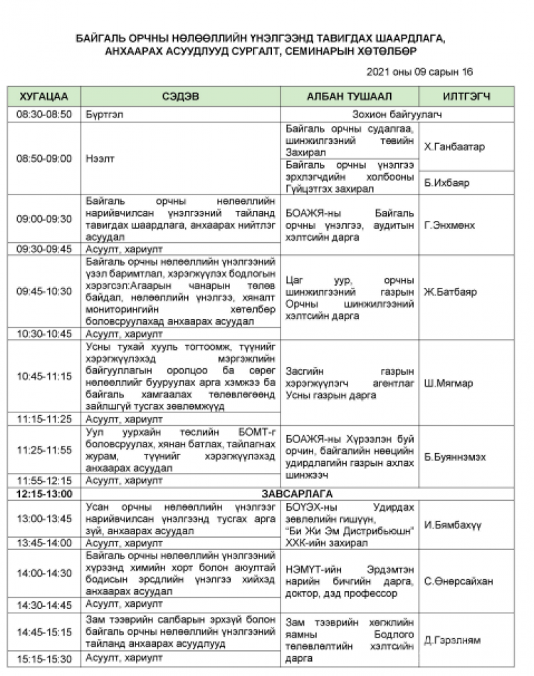 Байгаль орчин, аялал жуулчлалын сайдын 2021 оны А/66 дугаар тушаалын дагуу "Байгаль орчны нөлөөллийн нарийвчилсан үнэлгээ хийх эрх бүхий мэргэжлийн байгууллагын мэргэжилтнүүдийг чадавхжуулах" сургалтыг зохион байгуулах ажлын хүрээнд хийгдэж буй цахим сургалтад идэвхтэй хамрагдахыг хүсье.