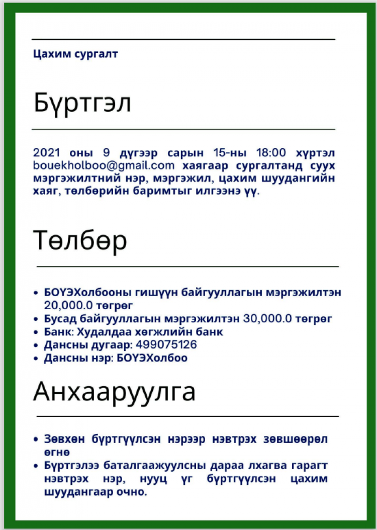 Сургалт есдүгээр сарын 16-ны өдөр болно.