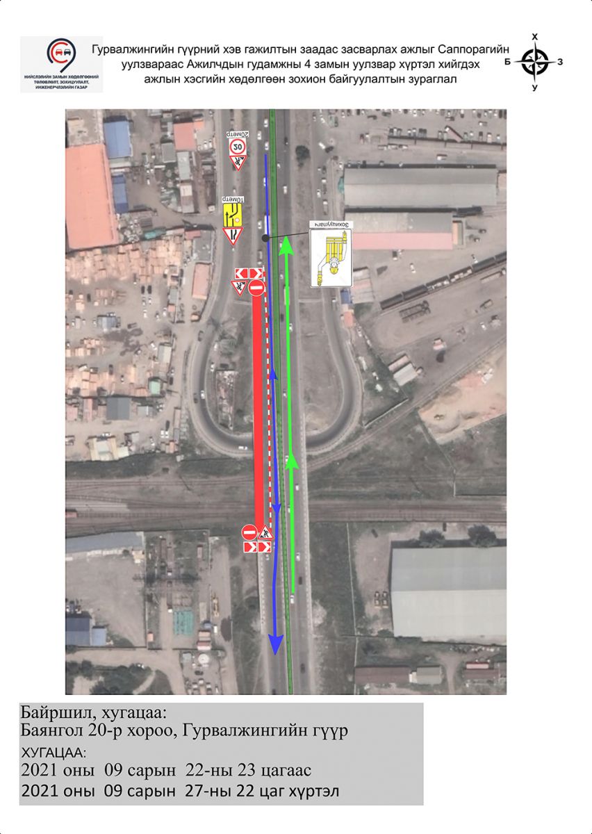Гурвалжингийн гүүрэнд хэв гажилтын заадас засварлах ажил хийнэ. Энэ хүрээнд Ажилчдын гудамжны дөрвөн замын уулзвараас Саппорагийн уулзвар хүртэл буюу урдаас хойш чиглэсэн автомашины зорчих хэсгийн нэгдүгээр эгнээний хөдөлгөөнийг есдүгээр сарын 17-ны 23:00 цагаас есдүгээр сарын 20-ны 07:00 цагийн хооронд хаана. Мөн хоёрдугаар эгнээний хөдөлгөөнийг есдүгээр сарын 20-ны 08:00 цагаас есдүгээр сарын 22-ны 22:00 цаг хүртэл хязгаарлах юм.