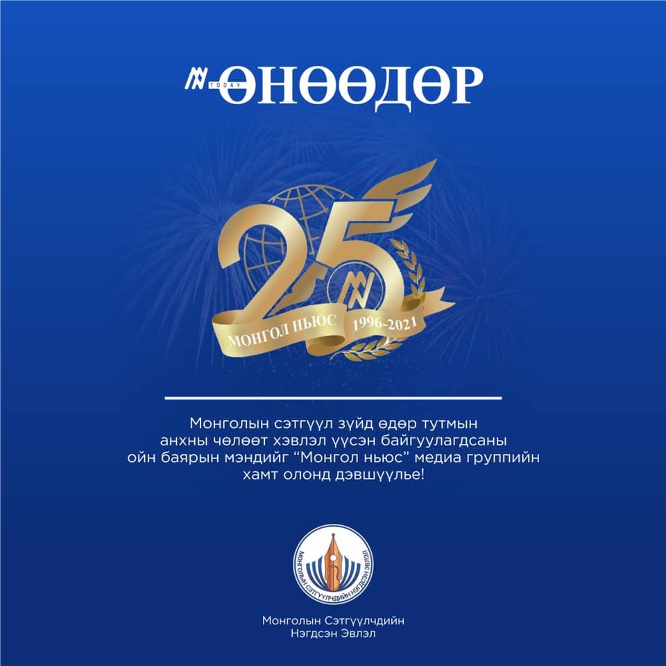 Монголын Сэтгүүлчдийн Нэгдсэн Эвлэлээс “Монгол ньюс” медиа группийн хамт олонд Монголын сэтгүүл зүйд өдөр тутмын анхны чөлөөт хэвлэл үүсэн байгуулагдсаны ойн баярын мэндчилгээ дэвшүүллээ.