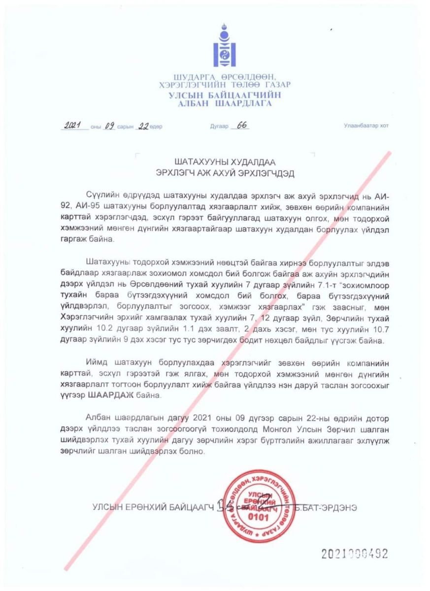 Иймд шатахуун борлуулахдаа хэрэглэгчийн зөвхөн өөрийн компанийн карттай эсвэл гэрээтэй гэж ялгах, мөн тодорхой хэмжээний мөнгөн дүнгийн хязгаарлалт тогтоон борлуулалт хийж байгаа үйлдлээ нэн даруй зогсоохыг ШААРДАЖ байна" гэжээ.