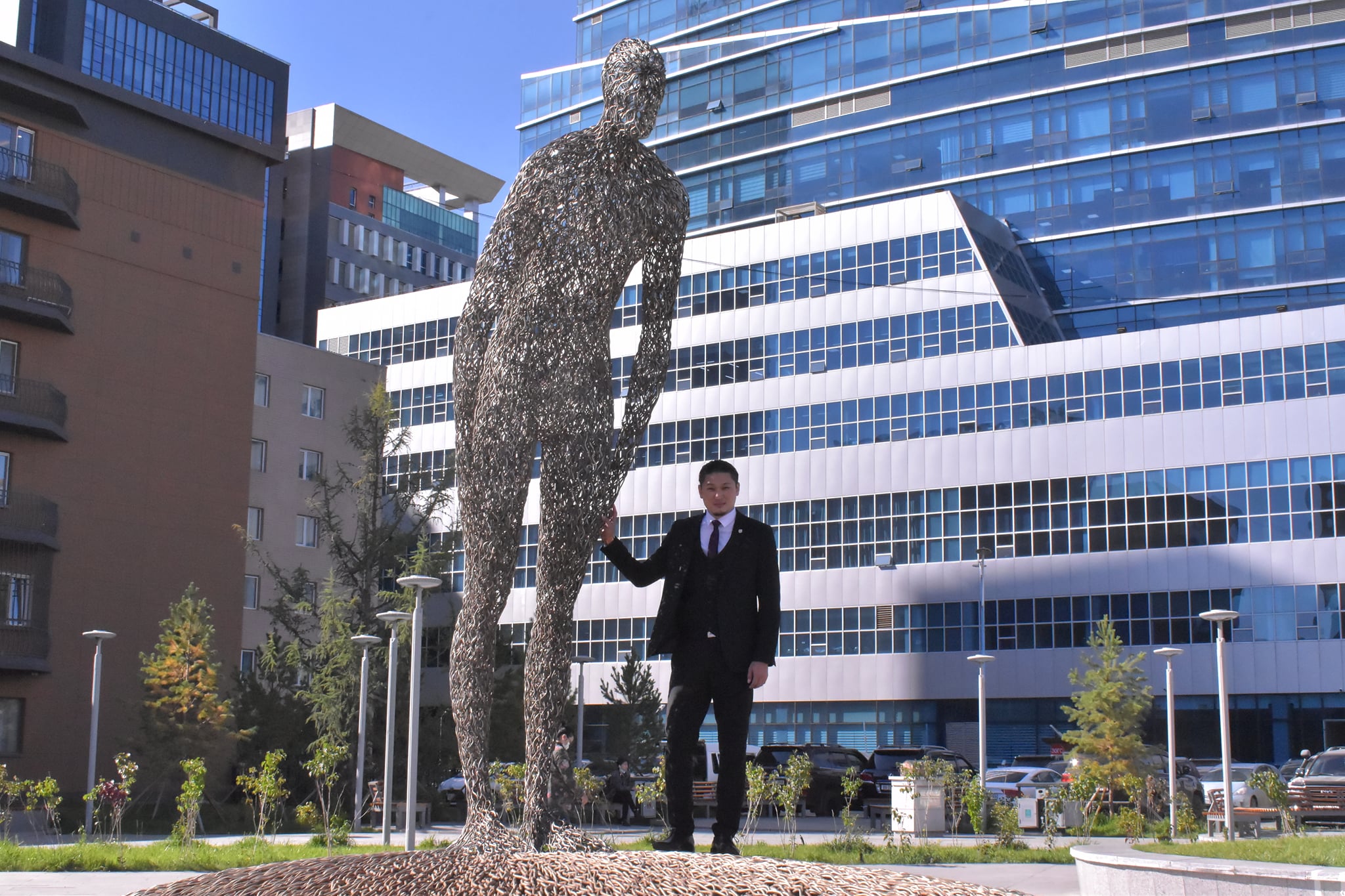 Харин бүтээлийн эзэн, уран барималч А.Очирболд ярилцлага өгөх үеэрээ хөшөөгөө хүндэтгэн, өмнө нь зогсжээ.