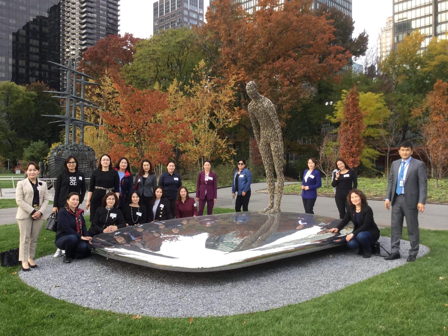 АНУ-ын Нью Йорк хотын НҮБ-ын төв байрны цэцэрлэгт хүрээлэнд сүндэрлэсэн “Ухамсар” хөшөөний дэргэд дурсгалын зураг авахуулсан монголчууд