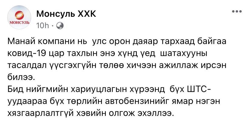Тэгвэл “Монсуль” ХХК бүх төрлийн автобензинийг хязгаарлалтгүйгээр олгож эхэлснээ мэдэгдээд байна.
