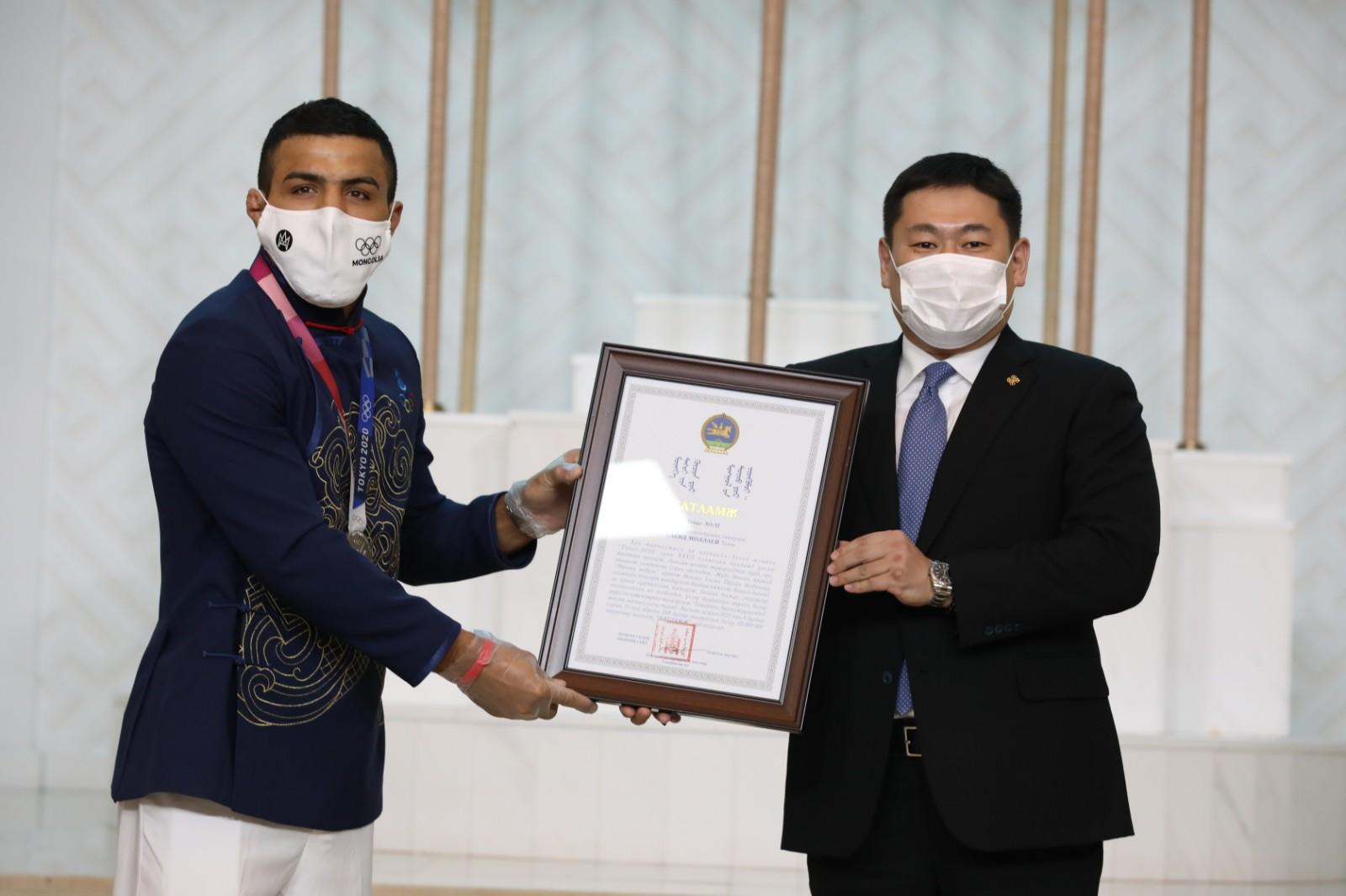 Монгол Улсын Ерөнхий сайд Л.Оюун-Эрдэнэ "Токио-2020" олимпын наадмаас медаль хүртсэн баг, тамирчдыг хүлээн авч уулзан, Засгийн газрын тогтоолын дагуу мөнгөн шагнал олголоо.