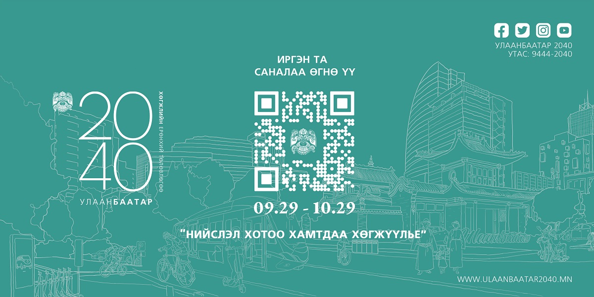 Хот байгуулалтын тухай хууль, “Хот, тосгоны хөгжлийн ерөнхий төлөвлөгөөний төслийг олон нийтээр хэлэлцүүлэх журам”-ын дагуу Хөгжлийн ерөнхий төлөвлөгөөний төсөлд 2021 оны есдүгээр сарын 29-нээс аравдугаар сарын 29-ний хооронд нэг сарын хугацаанд иргэд, олон нийтээс санал авах юм. Монгол Улсын нийслэл Улаанбаатар хотын ирээдүйн 20 жилийн хөгжлийг тодорхойлох хариуцлагатай үйл ажиллагаанд иргэн таны санал, оролцоо нэн чухал юм. Иймд иргэн та https://www.ulaanbaatar2040.mn/ вэб хуудас,