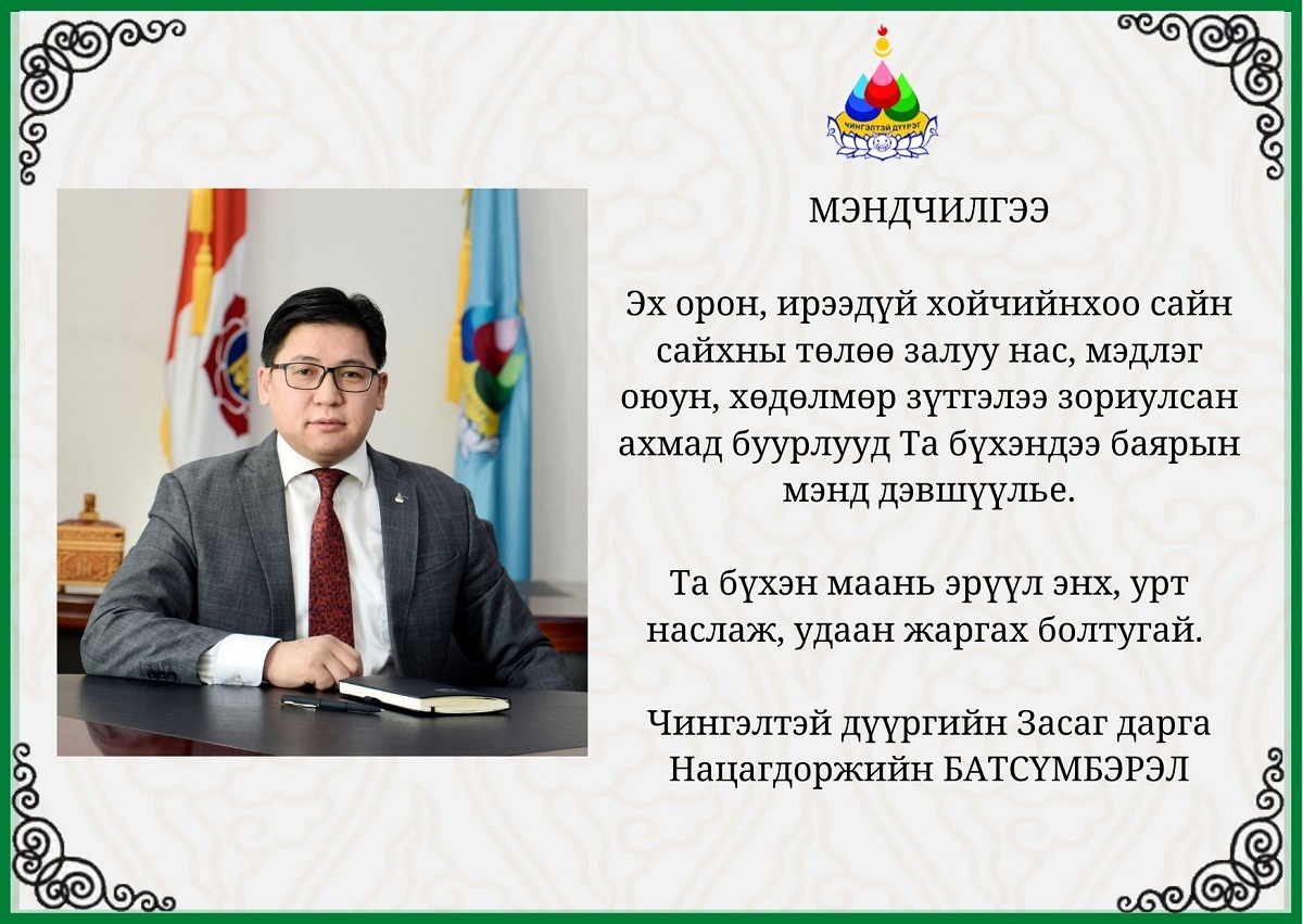 Чингэлтэй дүүргийн Засаг дарга Н.Батсүмбэрэл "Ахмадын баяр"-ын өдрийг тохиолдуулан эх орон, ирээдүй хойчийнхоо төлөө залуу нас, мэдлэг оюун, хөдөлмөр зүтгэлээ зориулсан ахмад буурлууддаа МЭНДЧИЛГЭЭ дэвшүүллээ.