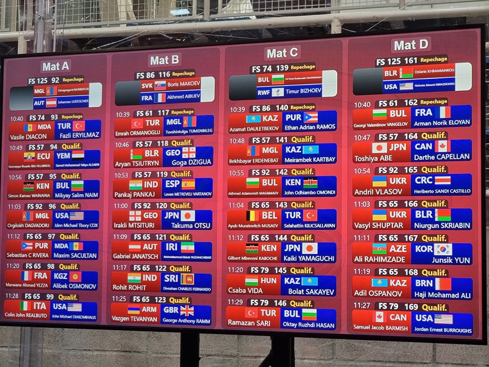 Хамгийн түрүүнд А дэвжээн дээр 125 кг-ийн М.Лхагвагэрэл Австрийн Йоханнес Людуширтай дагах барилдаан хийнэ. Дараа нь В дэвжээн дээр 61 кг-д Т.Түвшинтулга Туркийн Эмрах Орманоглутай барилдана.