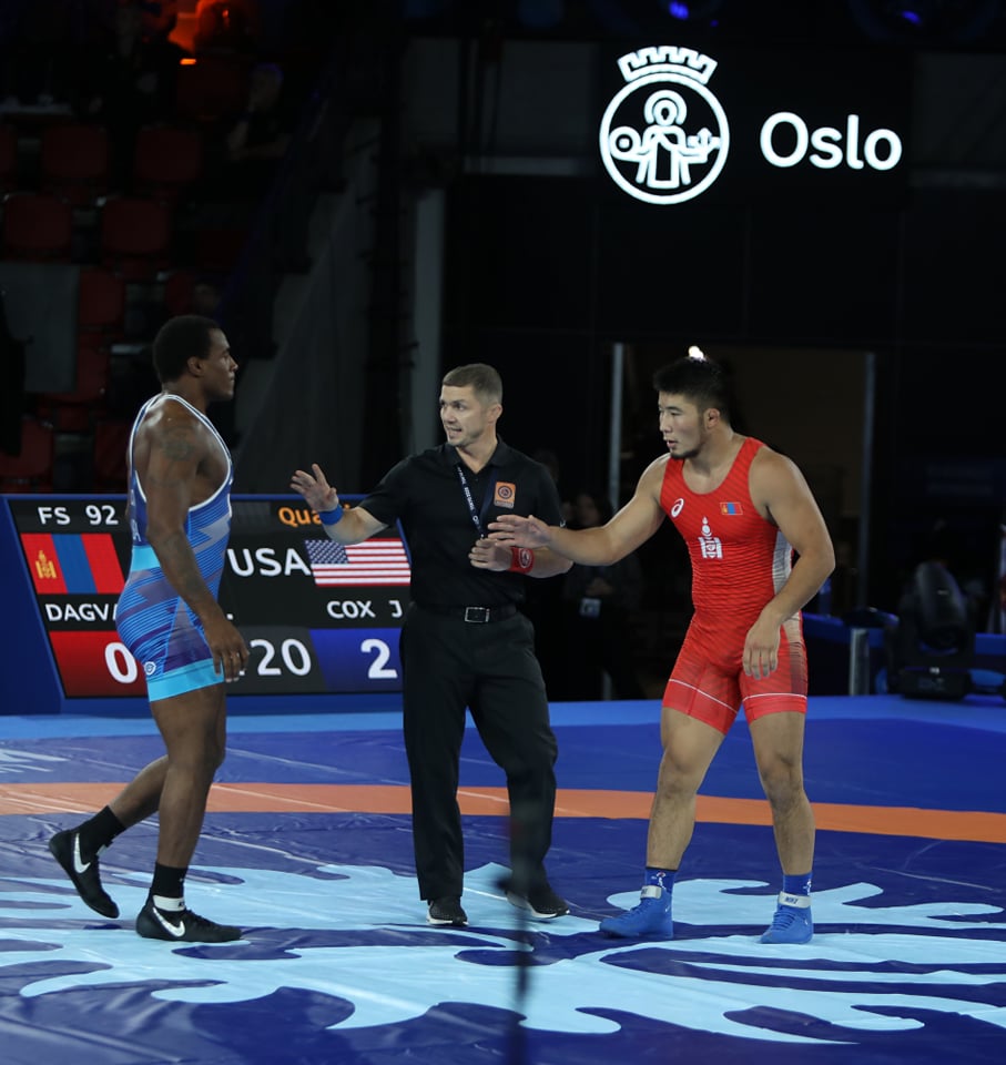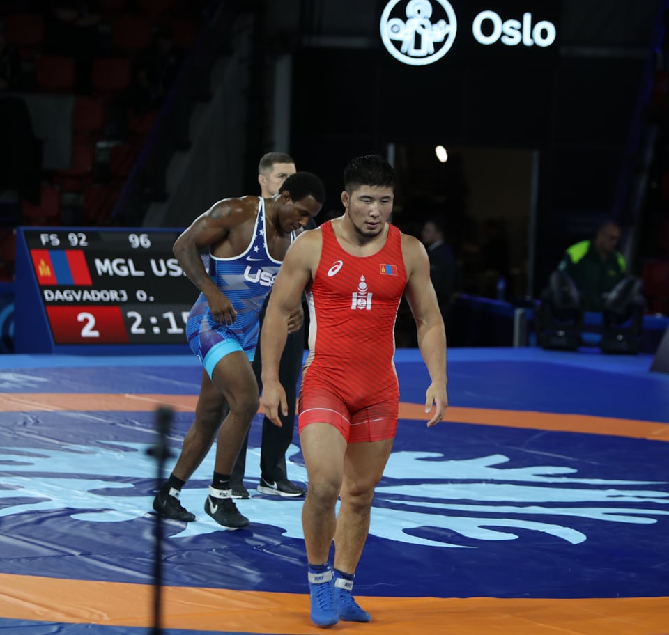 92 кг-ын жинд ДАШТ-д анх удаа зодоглож буй “Хасу-Мегастарс” клубийн залуу тамирчин, спортын мастер Дагвадоржийн Оргилох тэгшитгэлийн барилдаанд “Рио-2016” олимпийн наадмын хүрэл медальт, дэлхийн хошой аварга АНУ-ын Жейден Кокстой зоримог шийдэмгий барилдсан ч 2:13-аар ялагдлаа.