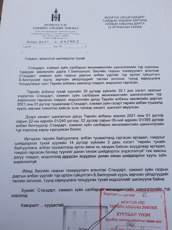 Шалгалтаар тус агентлагийн Тамгын газрын орон нутгийн төсөв санхүүгийн асуудал хариуцсан нэг ахлах мэргэжилтний албан тушаалд давхардуулан О.Оюунтуяаг, эрх зүйн асуудал хариуцсан мэргэжилтний албан тушаалд Б.Эрхүүг томилсон шийдвэр гаргасан байдаг. Энэ шийдвэр нь төрийн албаны тусгай шалгалт өгөөгүй, Төрийн албаны зөвлөлөөс нэр дэвшүүлж, томилох эрх бүхий этгээдэд санал хүргүүлээгүй байхад төрийн жинхэнэ албан тушаалд иргэнийг томилсон нь хууль зөрчсөн байна гэж дүгнэсэн тул тэрээр бүх тушаалуудаа хүчингүй болгож байжээ.