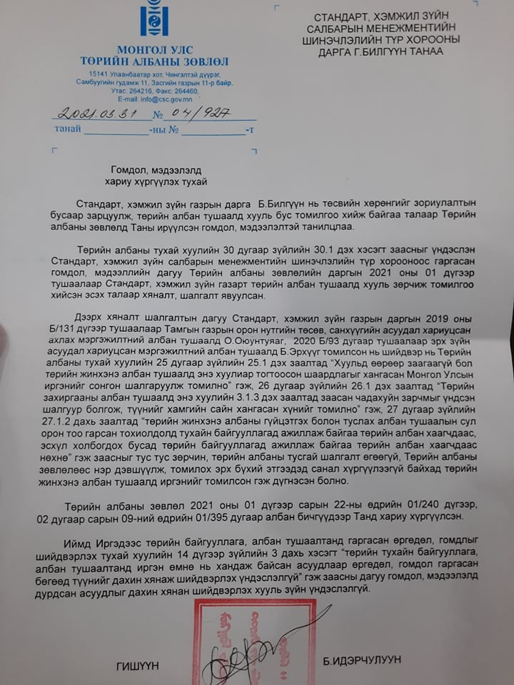 Стандартчилал, хэмжилзүйн салбарт бугшсан хууль бус үйлдлүүдийг таслан зогсоох талаар иргэд, төрийн албан хаагчдаас удаа дараа Монгол Улсын Шадар сайд, Төрийн албаны зөвлөлд санал гомдол хүргүүлдэг боловч эцэслэн шийдэж хариуцлага тооцохгүй байгаагаас хууль бус ажиллагаа даамжирсаар байна.