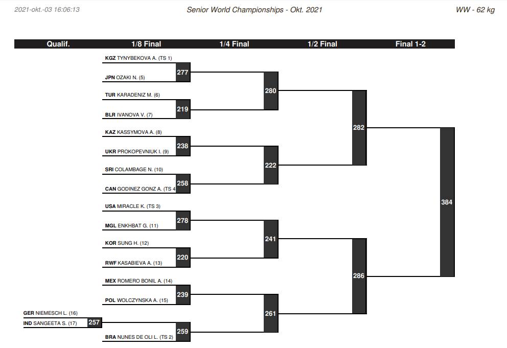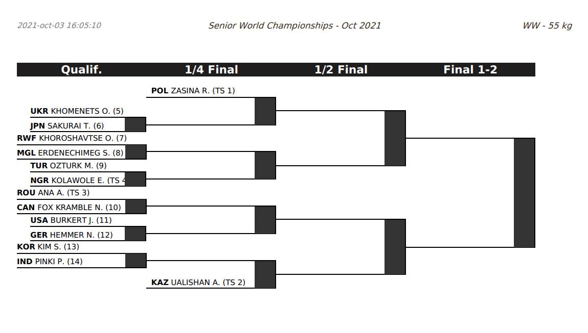 Эмэгтэй 55 кг-д 14 бөх барилдана. Э.Сумьяа эхний тойрогт 2019 оны ДАШТ-ий хүрэл медальт, Европын сүүлийн хоёр жилийн аварга, ОХУ-ын Ольга Хорошавцеватай барилдана.