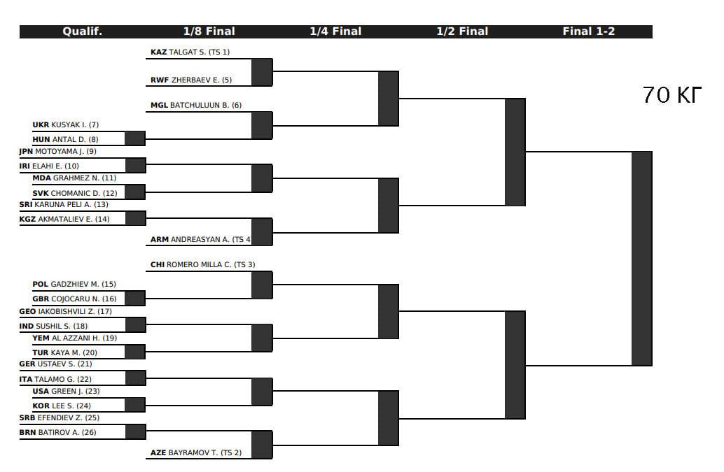 Б.Батмагнай 1/8 финалд Иван Кусяк (Украин), Даниел, Антал (Унгар) хоёрын ялсантай барилдана. Эхний барилдаандаа давахад Буриадын Евгений Жербаевтай таарах магадлал өндөр. Евгений эхлээд Казахстаны Талгаттай таарсан байгаа.