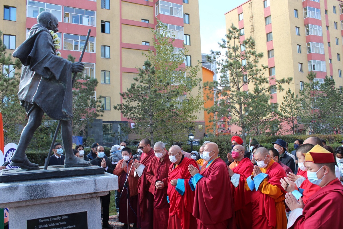Гандан, Дашичойлинг, Петхуб хийдүүдийн бурхан шашны лам нар дэлхийн энх тайвны төлөө ном айлдаж, Монгол дахь хинди хэл сурч буй оюутнууд Гандигийн дуртай "Рагхупати Рагхав Ража Рам", "Вайшнав Жан Тэ" дууг дуулав.