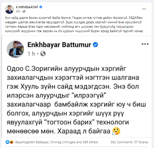 Тэрбээр "Одоо С.Зоригийн алуурчдын хэргийг захиалагчдын хэрэгтэй нэгтгэн шалгана гэж Хууль зүйн сайд мэдэгдсэн. Энэ бол илэрсэн алуурчдыг “илрээгүй” захиалагчаар бамбайлж хэргийг юу ч биш болгох, алуурчдын хэргийг шүүх рүү явуулахгүй “тогтоон барих” технологи мөнөөсөө мөн. Хараад л байгаа" гэсэн юм.
