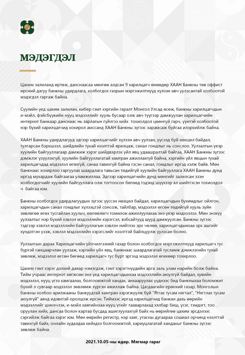 Сүүлийн үед цахим залилан, кибер гэмт хэргийн гаралт Монгол Улсад өсөж, банкны харилцагчдын и-мэйл, фэйсбүүкийн нууц мэдээллийг хууль бусаар олж авч түүгээр дамжуулан харилцагчийн интернэт банкаар данснаас нь зарлагын гүйлгээ хийх тохиолдол цөөнгүй гарч, үүнтэй холбоотой нэр бүхий харилцагчид хохирол амссанд ХААН Банкны зүгээс харамсаж буйгаа илэрхийлж байна.