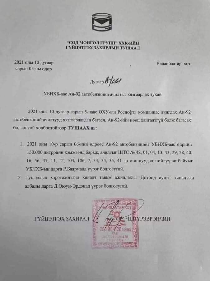 ОХУ-ын "Роснефть" компаниас авчрах АИ-92 автобензиний ачилт хязгаарлагдсан тул өнөөдрөөс (2021.10.05) АИ-92-ын нөөц дахин хангалтгүй болж эхэлжээ.