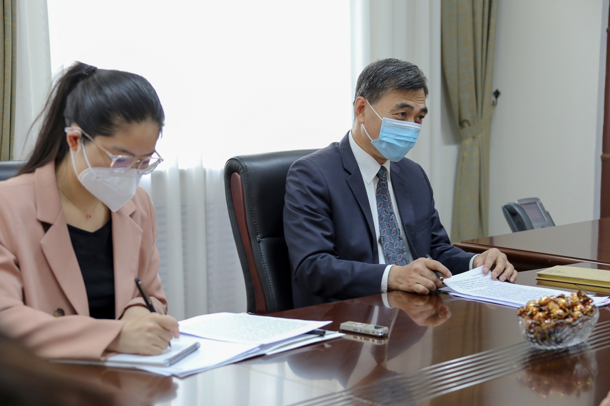Түүнчлэн, өнөөгийн олон улсын тавцанд өрнөж буй үйл явдлуудын талаар Дэд сайд Б.Мөнхжин, Элчин сайд Чай Вэньруй нар харилцан санал солилцож, байр сууриа илэрхийлэв.