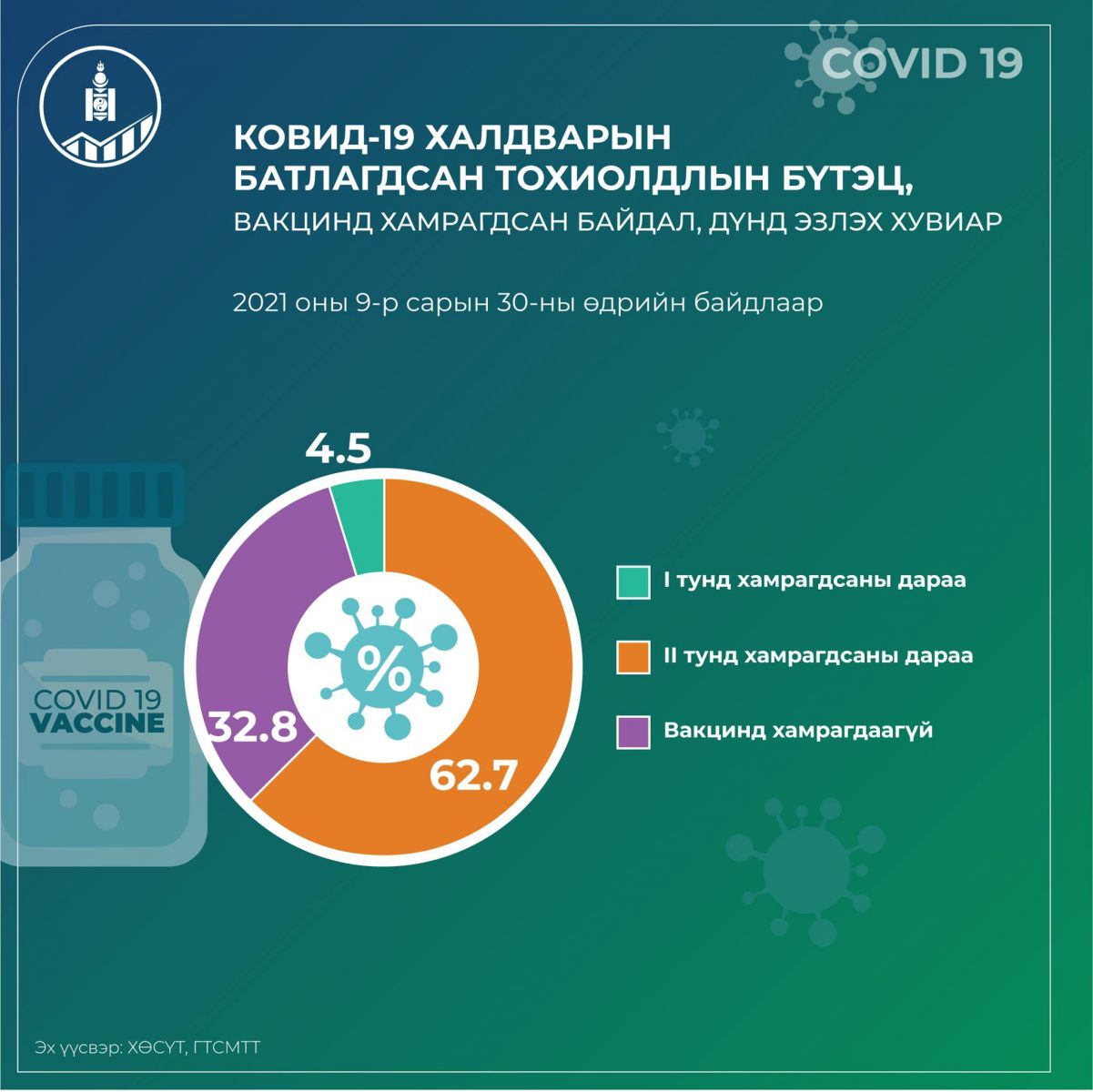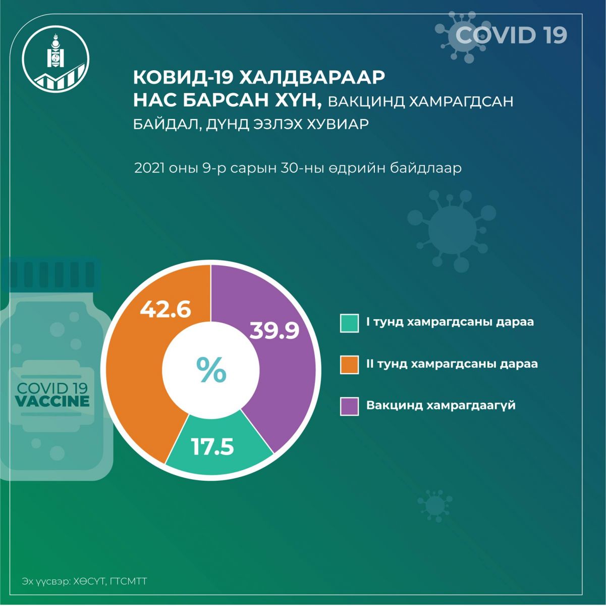 Тэгвэл Үндэсний статистикийн хорооноос 2021 оны есдүгээр сарын 30-ны өдрийн байдлаарх ковидын өвчлөл, нас баралтын мэдээллийг дараах инфографикаар хүргэж байна. Ковидын халдвараар нас барсан хүмүүсийн тоон мэдээллийг гаргахдаа вакцинд хамрагдсан байдал, дүнд эзлэх хувиар тооцжээ. Уг вирусээр өвчлөн амиа алдсан иргэдийн 42.6 хувь нь вакцины хоёр тунд хамрагдсан гэсэн мэдээллийг өгч байна.