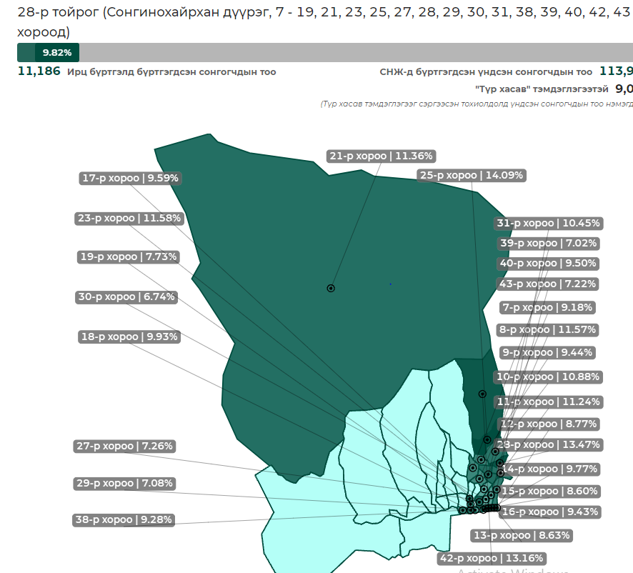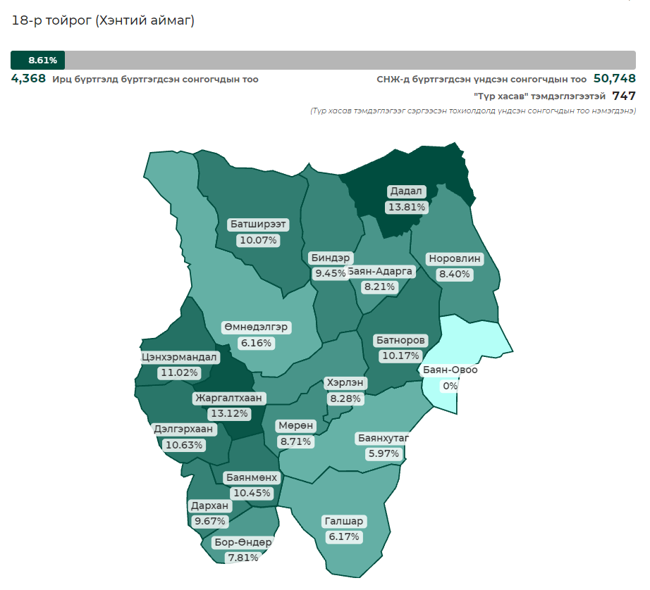 Сонгуулийн ерөнхий хорооны мэдээлснээр сонгогчдын ирц 11:00 цагийн байдлаар Хэнтий аймгийн 18 дугаар тойрогт 8.61 хувьтай байгаа бол Сонгинохайрхан дүүргийн 28 дугаар тойрогт 9.82 хувьтай байна.