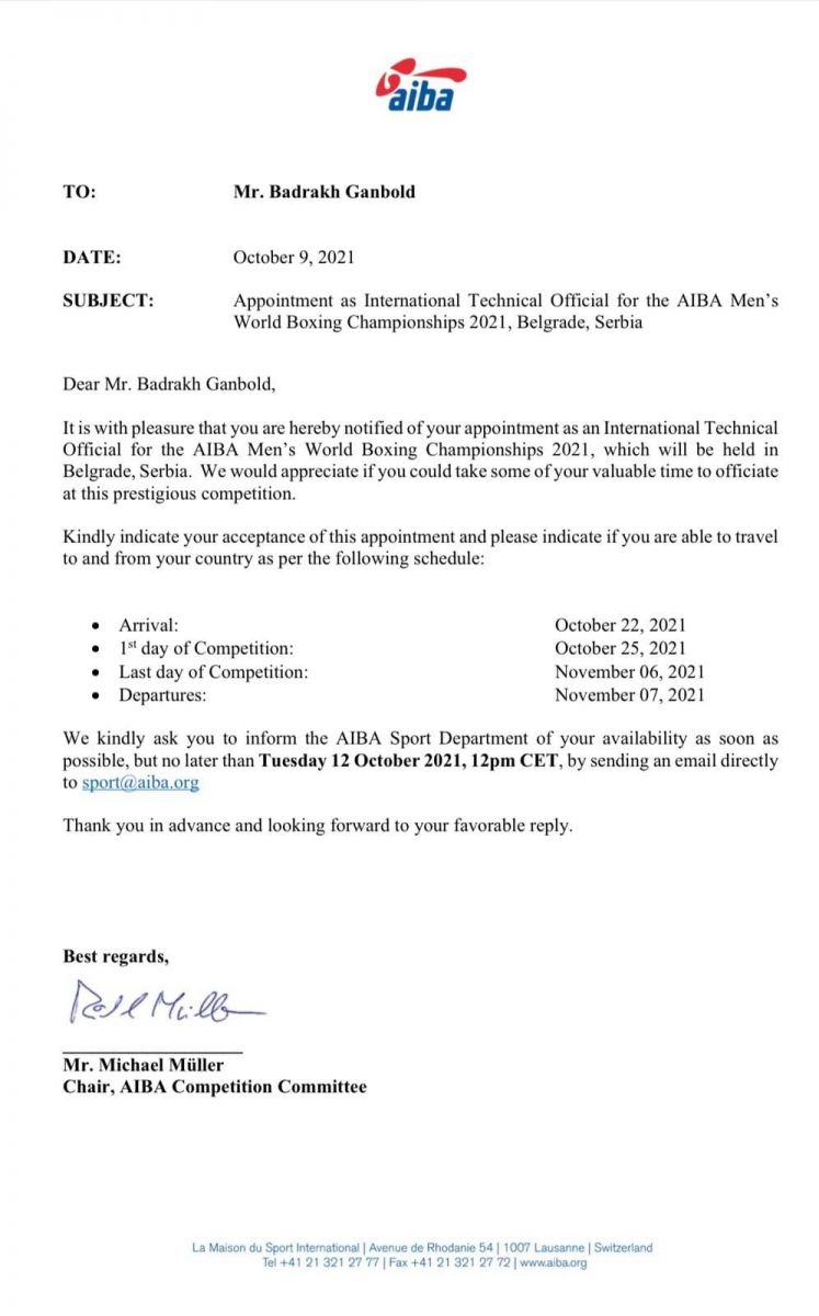 Серби улсын Белград хотноо 10-р сарын 22-ноос 11-р сарын 07-ны өдрүүдэд зохион байгуулагдах "БЕЛГРАД-2021" Боксын дэлхийн аварга шалгаруулах тэмцээнийг зохион байгуулах хороонд Г.Бадрах уригдан ажиллахаар боллоо.
