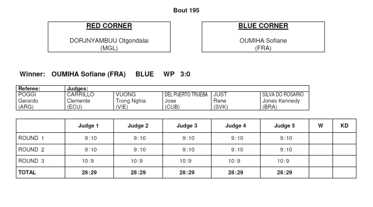 Монголчууд хахууль төлөөгүй. Рысбаевын сүрүүлээд байсан монгол боксчин хагас шигшээд 0:3 ялагдсан. Одоогийн байдлаар MIIT ямар нэг дүгнэлт хийгээгүй байгаа ч энэ тулааны шүүлтийн дүнд бүх таван шүүгч франц боксчинд ялалт өгсөн байжээ. Тун ойролцоо болсон тулаан гэхэд шүүлт арай сэжигтэй байгаа юм.
