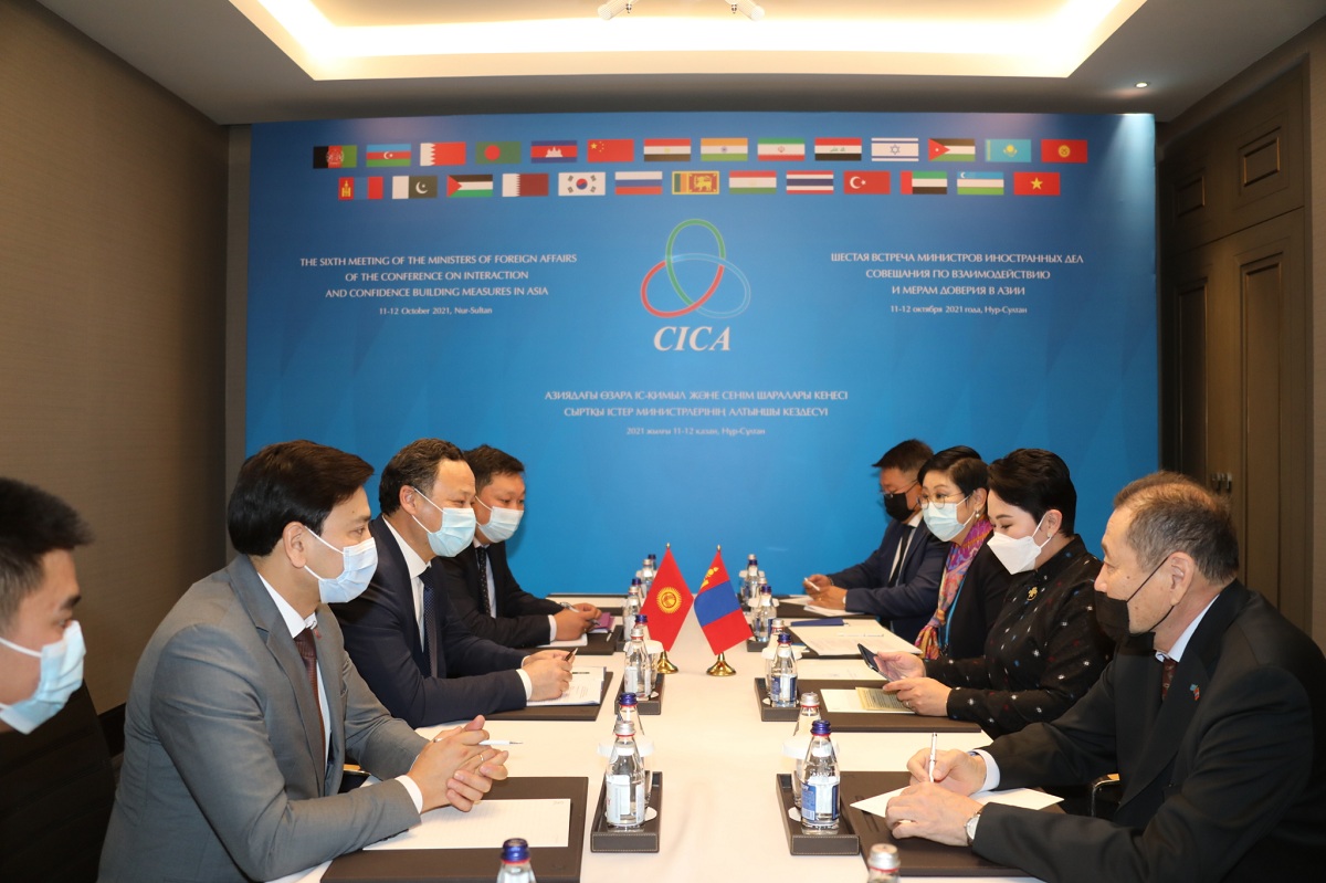 Гадаад харилцааны сайд Б.Батцэцэг Бүгд Найрамдах Казахстан Улсын нийслэл Нур-Султан хотноо зохион байгуулагдаж буй Азид хамтын ажиллагаа, итгэлцлийг бэхжүүлэх бага хурал (АХАИББХ)-ын Гадаад хэргийн сайд нарын 6 дугаар уулзалтад оролцох үеэрээ Бүгд Найрамдах Киргиз Улсын Гадаад хэргийн сайд Р.А.Казакбаевтай ажлын уулзалт хийв.