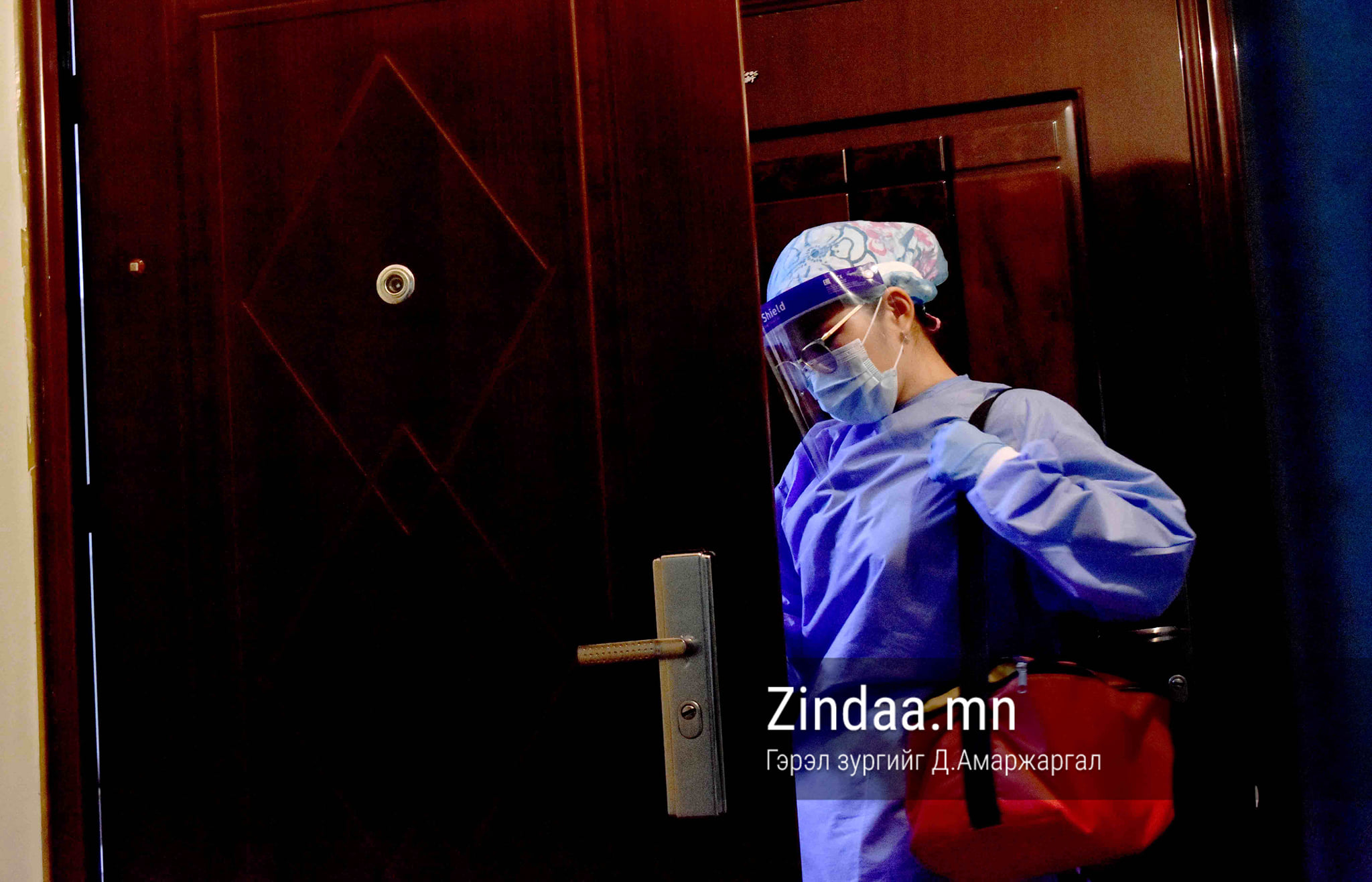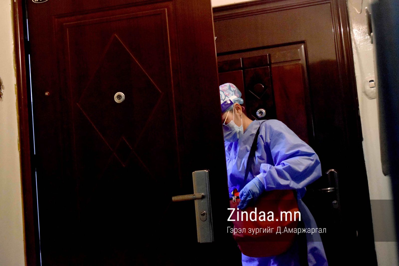 Энэ байранд дуудлага өгсөн хоёр айл байгаа аж. Эхний айл хаалгаа онгойлгоогүй тул дараагийн айлын хаалгыг татав. Энд гурван хүүхэдтэй ганц биш ээж байдаг аж. Энэ талаар эмч “Анх ирэхдээ хүүхэд маань өндөр халуураад байна гэж ирсэн. Улмаар шинжилгээ аваад эерэг гарсан байгаа. Зургаа хоногийн дараа ойрын хавьтал болох хоёр дүүгээс нь шинжилгээ авахад эерэг гарсан. Ээж нь бол өмнө нь халдвар аваад эдгэсэн. Хүүхдүүд нь халдвар аваад долоо хонож байна. Энэ хугацаанд гурав дахь удаагаа ирж үзлэг хийж байна” гэлээ.