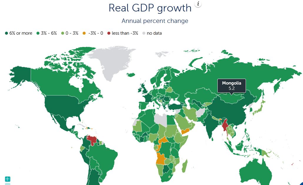 Тэгвэл тус байгууллагаас Монгол Улсын эдийн засгийн өсөлтийг энэ онд 5.2 хувь байна гэж тооцжээ. Энэ нь өмнөх төсөөллөөс бага зэрэг буюу 0.2 пунктээр өссөн тооцоолол юм. Дөрөвдүгээр сарын тайландаа Монгол Улсын эдийн засгийн өсөлтийг энэ онд 5 хувь, 2022 онд 7.5 хувь байна гэж тооцсон байсан юм.