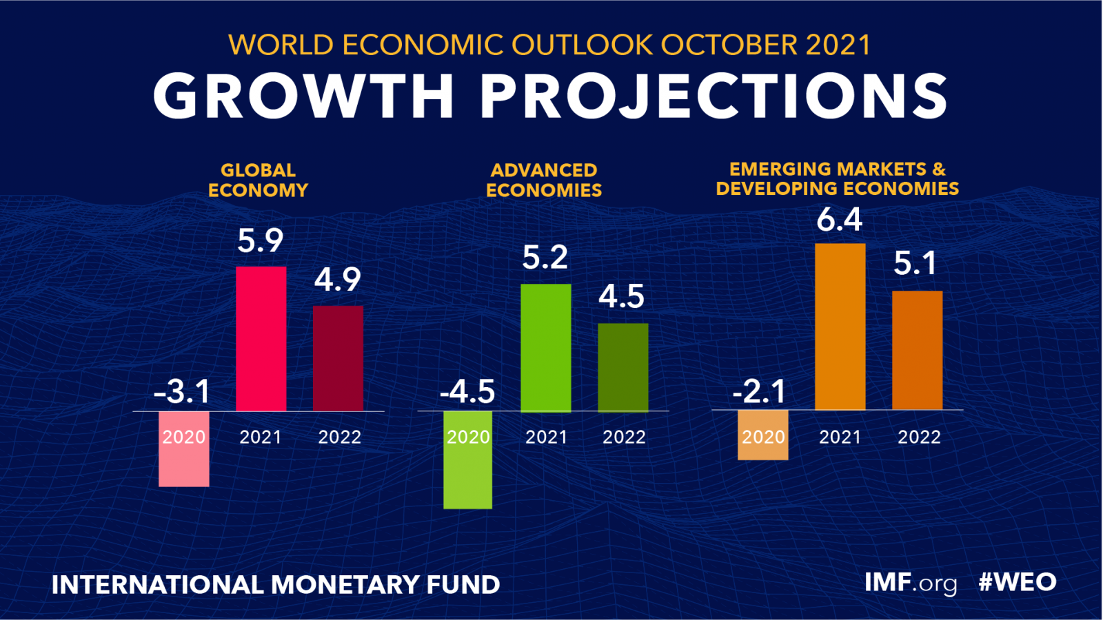 Олон улсын валютын сангаас “Дэлхийн эдийн засгийн төлөв байдал” шинэчилсэн тайлангаа танилцууллаа. Энэ онд дэлхийн эдийн засгийг 5.9 хувь, ирэх 2022 онд 4.9 хувиар өснө гэж төсөөлжээ. Энэ оны эдийн засгийн өсөлтийг 4.9 хувь байна гэж тооцсон нь өмнөх долоодугаар сарын таамаглалаас 0.1 пунктээр буурсан түвшин юм. Дэлхийн эдийн засгийн өсөлтийн төсөөллийг ийнхүү бууруулсан нь цар тахлын глобаль эдийн засаг дахь сөрөг нөлөөлөлтэй холбоотой байна.