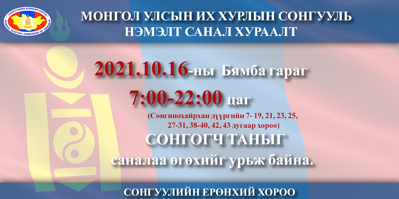 УИХ-ын 28 дугаар тойргийн нөхөн сонгуулийн нэмэлт санал хураалтад Сонгинохайрхан дүүргийн 7-19, 21, 23, 25, 27-31, 38-40, 42, 43 дугаар хорооны сонгогчид саналаа өгнө. Санал авах байрны байршлыг https://www.arcgis.com/apps/webappviewer/index.html... холбоосоор үзэх боломжтой.