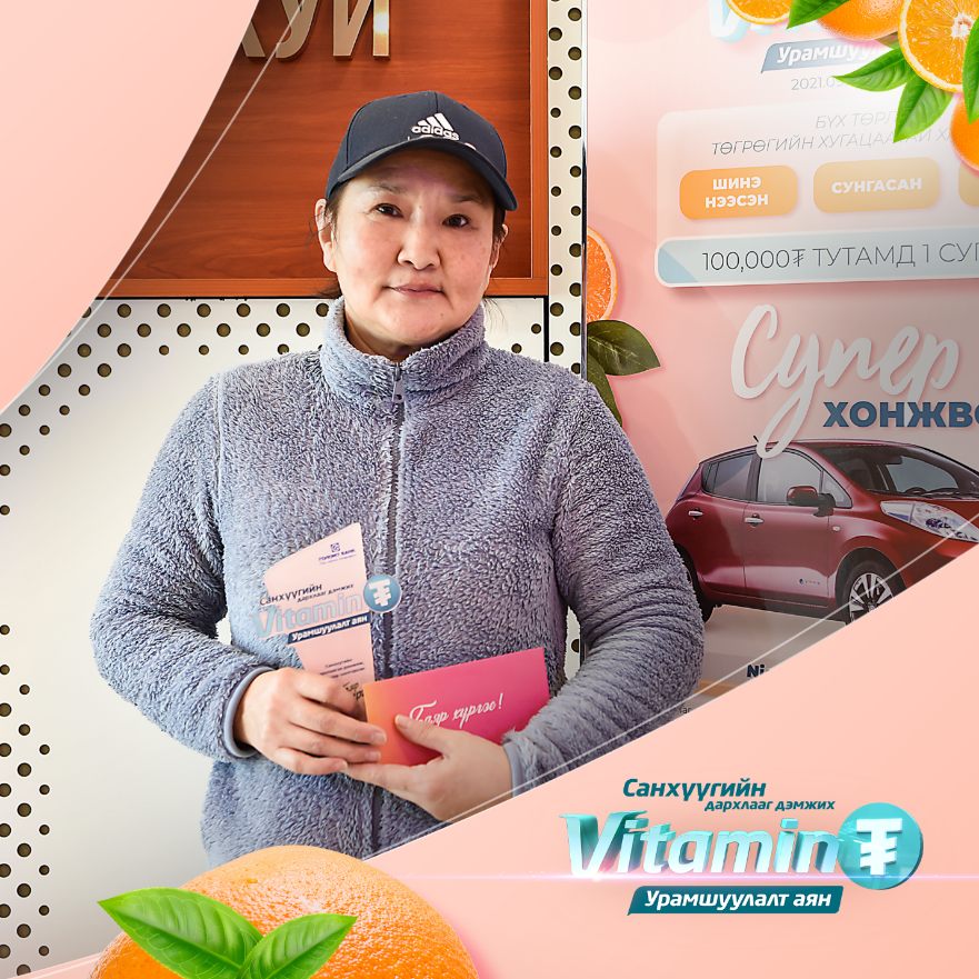 Баярлалаа. Хадгаламждаа орлого нэмээд “Витамин ₮” аянд оролцох эрхтэй болсон. Азтан болж, Имартын 100,000₮-ийн худалдан авалтын эрхийн бичиг хожсондоо баяртай байна.